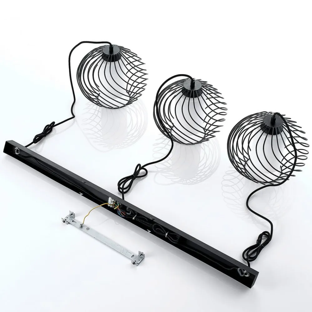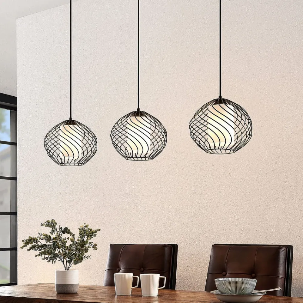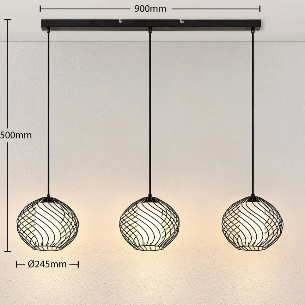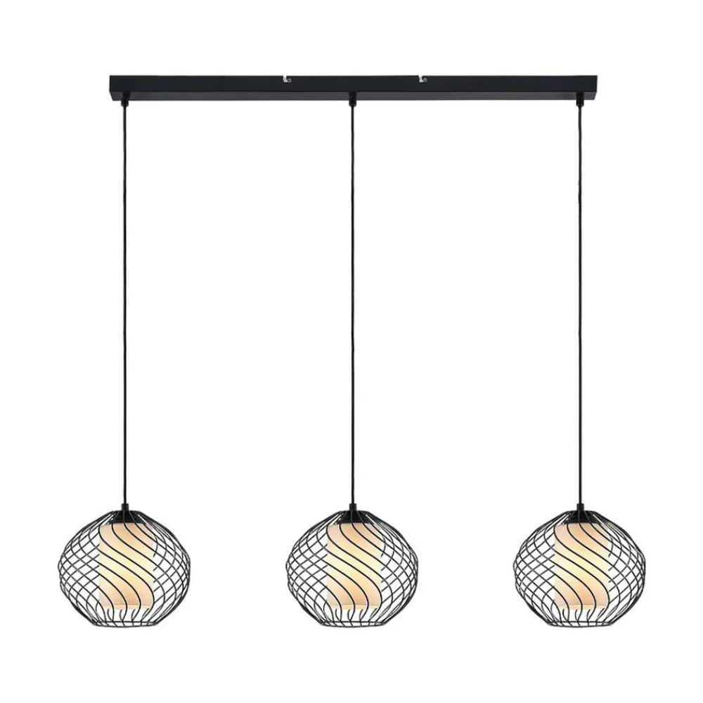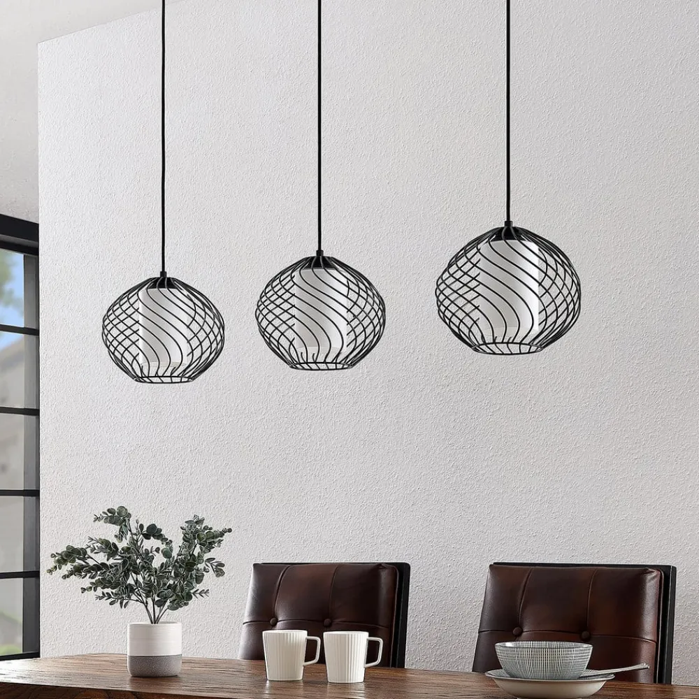 Burpendellampen Cedrice med 3 lyskilder som smuk spisebordsbelysning Cedrice er en pendellampe, der består af tre kugleformede skærme, som alle er lavet af metal og derfor ligner et bur. Hver stiver er buet og bølgende, hvilket giver lampen et særligt attraktivt udseende. Inde i kuglerne er der også hvide glaselementer over pærerne, som får lyset til at virke blødere og mere jævnt. Den aflange form i kombination med de tre lampeskærme er ideel til bordbelysning og stemningsfuld belysning af et spiseområde.