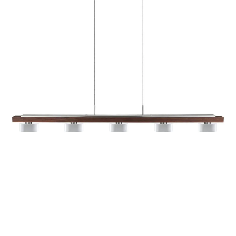 Estelle LED-hængelampe med træbjælke og glasskærme, der stråler opad og nedad Estelle LED-hængelampen kombinerer moderne design og naturlig udstråling til perfektion. Baldakinen og en strimmel på træpendlen er lavet af matbørstet nikkel med fem nedadvendte skærme af opalglas. De to kabler kan afkortes før installation, og højden på pendlen kan også justeres bagefter. Lysstyrken på de nedadrettede LED’er i glasskærmene og toplyset på stangen kan justeres separat ved hjælp af to berøringsdæmpere på stangen – Bæredygtigt træ fra FSC-certificerede leverandører – Dæmpbar: Dæmpning ændrer lysfarven – universalhvid for højt lysudbytte, varmhvid for lavt lysudbytte – Produceret i Tyskland