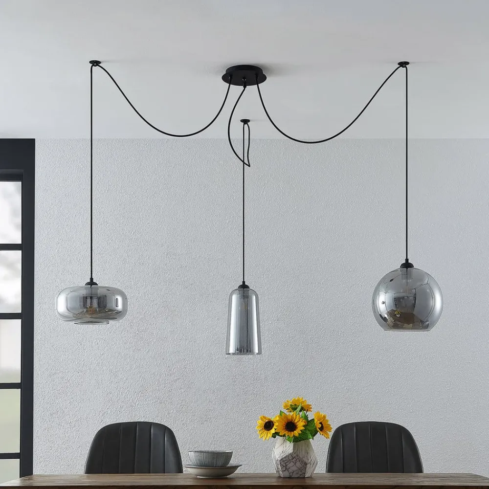 Røggrå glasskærme – Zyli pendellampe med et moderne look Zyli pendellampen med tre forskelligt formede glasskærme er lige velegnet til moderne boligområder som belysning og blikfang. De er lavet af røggråt glas og er fastgjort til baldakinen med et sort tekstilkabel. Zyli giver en lys og behagelig belysning, som kan bruges i selve rummet eller over borde. Vintage-møbler har også godt af at blive udstyret med Zyli-pendellampen.