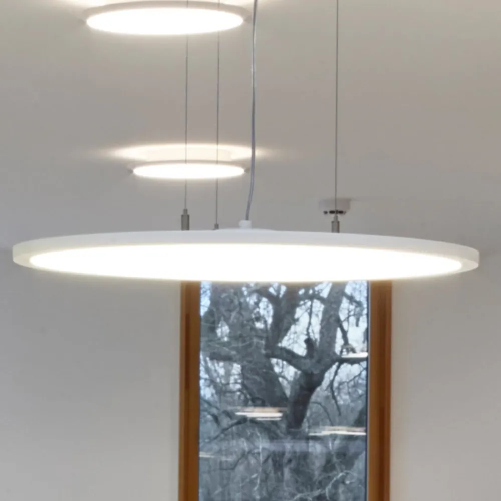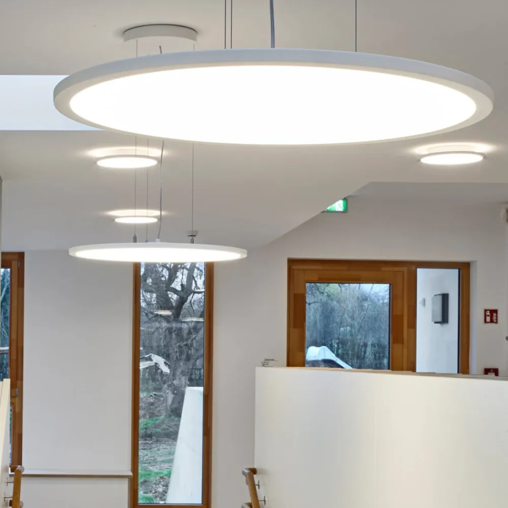 FL Round 777 PL OP LED-pendelarmaturet FL Round 777 PL OP giver en behagelig almen belysning af store områder i moderne indrettede kontorer og forretningslokaler. Det flade, runde design og den hvide, ridsefaste pulverlakering af det støbte aluminiumhus har en neutral visuel effekt. Den karakteristiske, homogene og brede lysudstråling sikres af den laterale lystilførsel (LED-sidelight-teknologi), den højtransmitterende lysleder og det opale plastdæksel.
