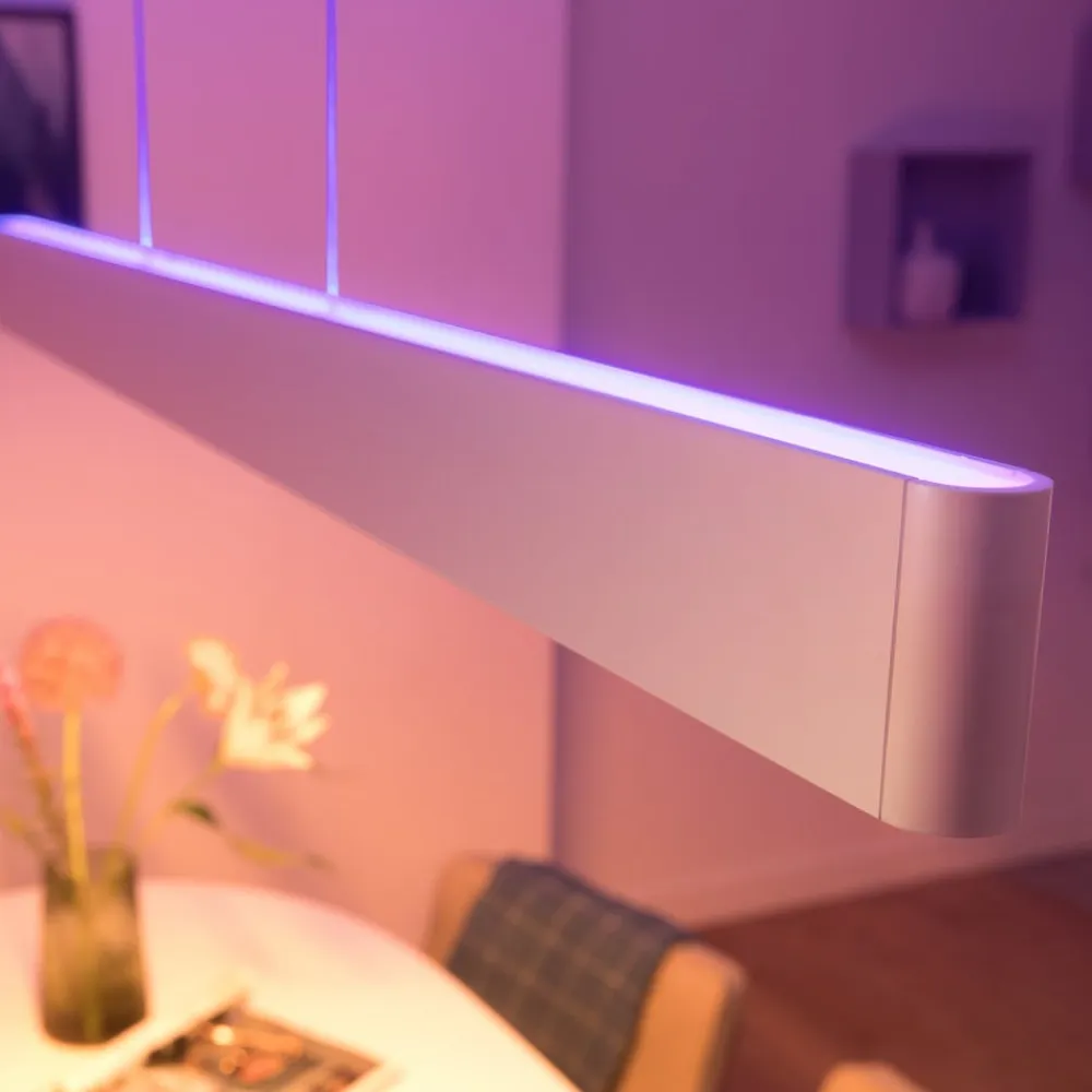 Ensis pendellampen er et absolut højdepunkt inden for alsidig og smart interiørbelysning. Den er udstyret med en opadgående og en nedadgående Hue-stribe i hvid og Color Ambiance-teknologi, som kan styres separat. På den måde opnås f.eks. direkte, hvidt, funktionelt lys og indirekte, farvestrålende rumbelysning på samme tid. Ensis er ideel til brug over borde i stuer og spisestuer.