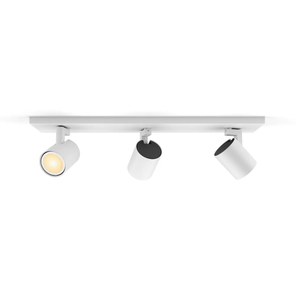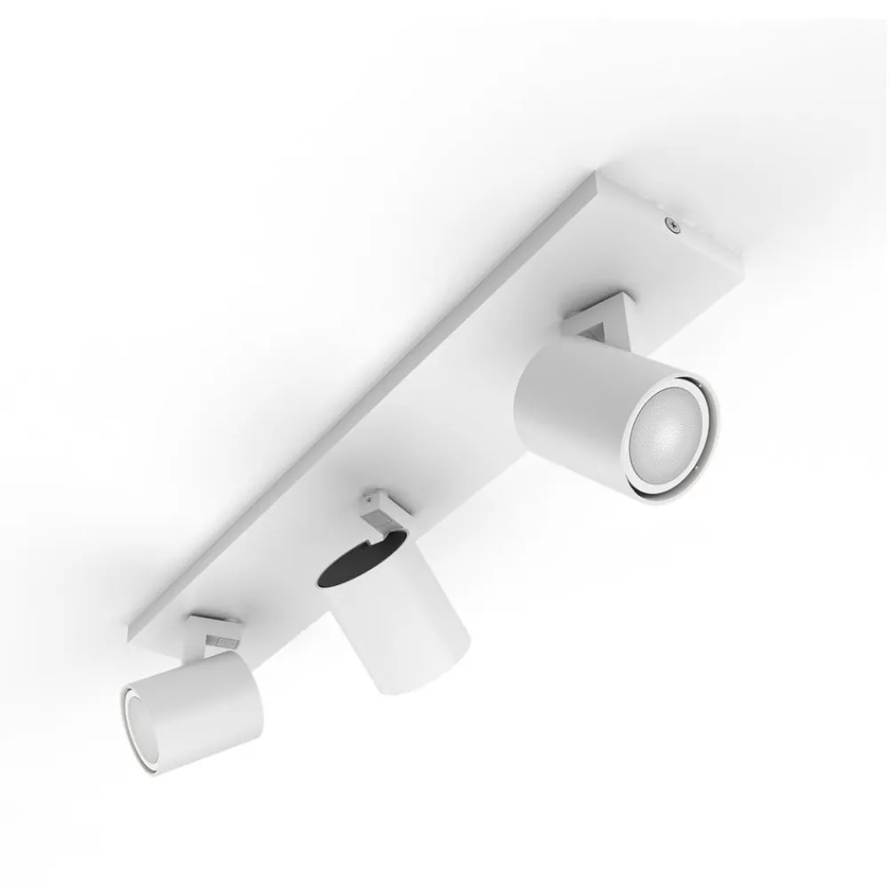 3 lyskilder Philips Hue LED Runner loftspot inkl. lysdæmper til praktisk lysstyring Runner LED-loftspot leveres med tre White Ambiance GU10 LED-lyskilder og en mobil lysdæmper. Armaturets ramme er lavet af robust metal. Den ret smalle metalstrimmel, som kan monteres både i loftet og på væggen, er udstyret med tre drejelige og svingbare spotlights, som kan tilpasses individuelt til rummets situation. Takket være den indbyggede ZigBee-standard kan lyset integreres i et eksisterende Hue-system, så lyset også nemt kan styres via mobiltelefon, tablet eller en kompatibel stemmeassistent. Alternativt kan lyset også styres med den medfølgende lysdæmper, som også fungerer uden at være tilsluttet et smart home-system, og som leveres med fire forskellige lysopskrifter. Afhængigt af humør eller tidspunkt på dagen kan lyset ikke kun dæmmes, men lystemperaturen (fra varmhvid til dagslys) kan også justeres individuelt, så lysbilledet til enhver tid kan tilpasses brugerens situation eller ønsker.