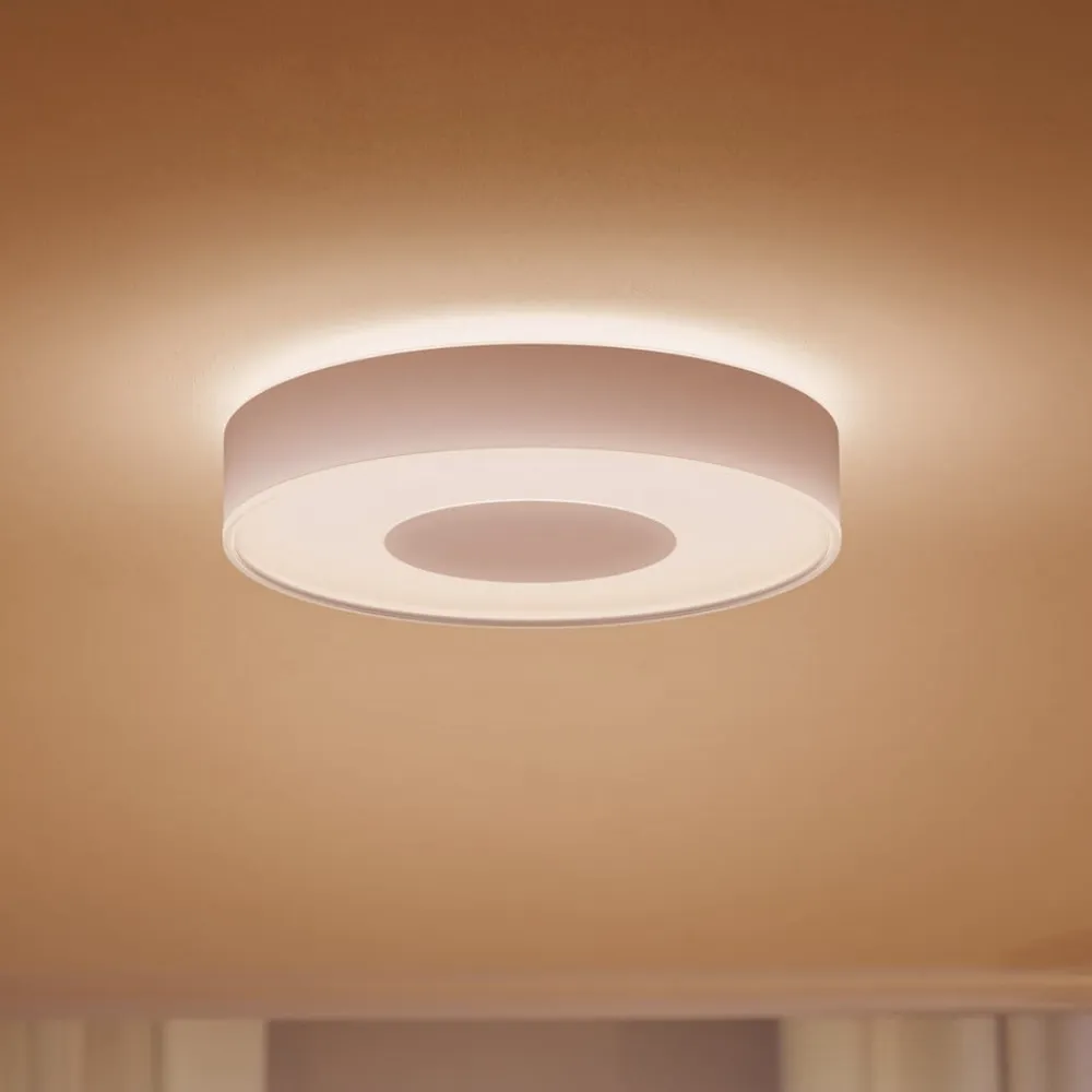 Smartstyrbar Philips Hue LED-loftslampe Infuse, White og Colour Ambiance Den moderne og elegante Infuse LED-loftslampe giver direkte lys og loftsbelysning for omfattende rumbelysning. Den har et rundt design med en ramme, der løber rundt om siderne, og et centralt dæksel på undersiden. Ud over hvidt lys i forskellige farvetemperaturer, som varm hvid eller dagslys, tilbyder armaturet også farvet lys, hvilket muliggør en lang række belysningsscenarier; lysstyrken kan også justeres til enhver tid. Lyset styres enten direkte via Bluetooth ved hjælp af en smartphone/tablet eller integreres i et smart home-system, såsom Philips Hue, via en ZigBee-bro. Særlige egenskaber/kompatibilitet – dæmpbar (via app, lysdæmperkontakt (medfølger ikke) eller stemmekommando) – justerbar lysfarve (varm hvid til dagslys, 16 mio. farvenuancer) – kompatibel med eksisterende lysnet. farvenuancer) – kompatibel med eksisterende Philips Hue-system – kan styres med passende Hue-app (i kombination med Hue Bridge) og Hue Bluetooth-app (direkte med smartphone/tablet) – kompatibel med andre ZigBee-baserede systemer, såsom Innogy, Bosch, Magenta (Telekom) og Busch-Jäger – mulighed for intelligent lysstyring a: ZigBee-integration via bro og router, såsom Philips Hue Bridge (se tilbehør); dette muliggør lokal- eller fjernstyring via Hue-appen og mulighed for stemmestyring via Amazon Alexa, Apple HomeKit (Siri) og Google Assistant.