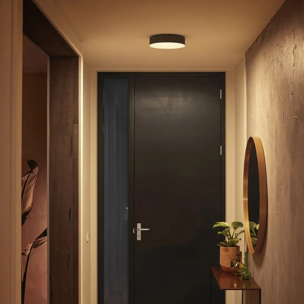 Philips Hue Enrave – smart styrbar LED-loftslampe med lysdæmper Den runde Hue Enrave LED-loftslampe giver klart lys over et stort område. Uanset om det er i stuen, gangen eller soveværelset, tilbyder Enrave justerbar lysstyrke og hvide toner i spektret fra varm hvid til dagslys, hvilket giver det rigtige lys på ethvert tidspunkt af dagen. Takket være den medfølgende lysdæmper kan loftslampen tændes, slukkes og dæmpes direkte. Alternativt kan lyset også styres via Bluetooth ved hjælp af din egen smartphone uden behov for yderligere enheder. Smart integration i et eksisterende Philips Hue smart home-system via Hue Bridge (se tilbehør) er også mulig.