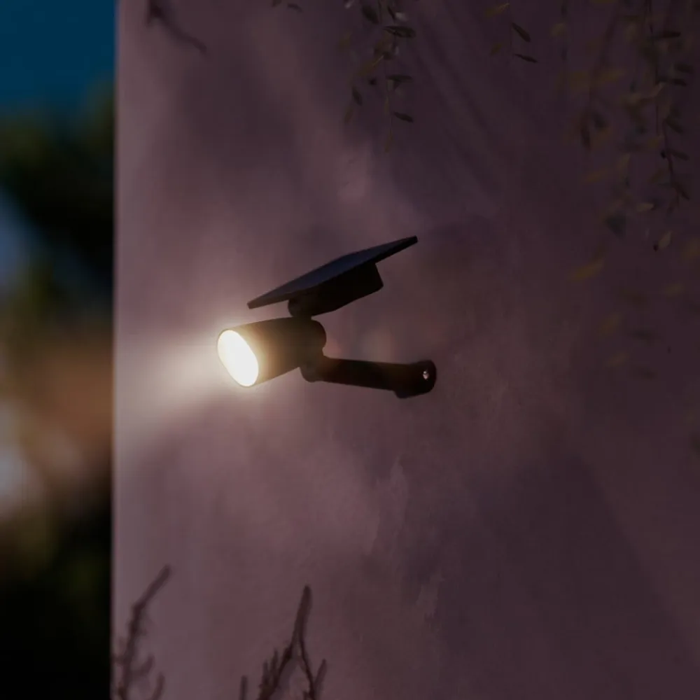 Den solcelledrevne LED-udendørs spot Ashlyn kan stikkes ned i jorden med jordspydet, men kan også monteres på væggen. Den udsender varmhvid belysning og er ideel til at skabe dekorative accenter i hele udendørsområdet uden energiforbrug.