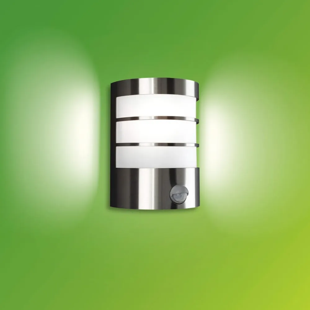 Denne udendørs væglampe i stål overbeviser med sit klassiske design, sine høje kvalitet og funktionalitet. Med sin stålblænde med to ribber, der omgiver den opalhvide glasdiffusor, er udendørs væglampe Calgary en dekorativ lampe til husfacader, som den oplyser med indirekte lys. Takket være den integrerede sensor tændes lampen efter behov og sørger for sikkerhed i mørket, hvilket gør den særligt velegnet til indgangsområder.