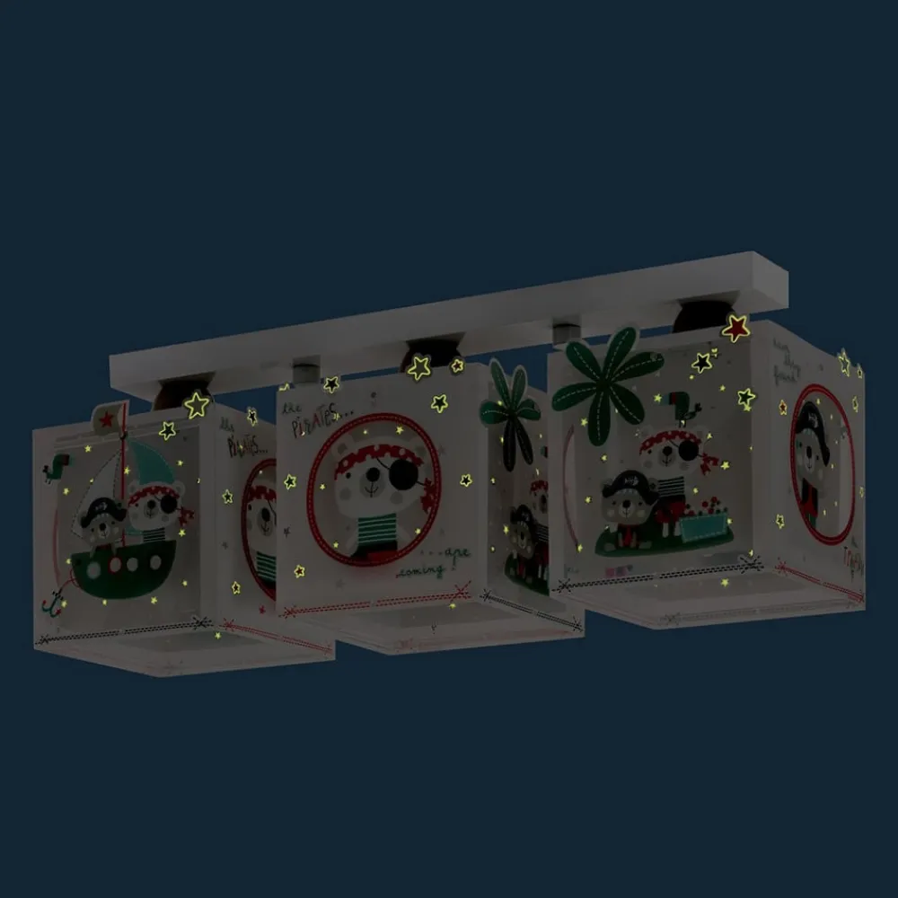 Pirates loftlampe til børneværelset med tre lys og kantede skærme Hver side af de tre kantede lampeskærme i Pirates-loftlampen er dekoreret med et smukt piratmotiv. Derudover er de yderste af de dobbeltlagede skærme dekoreret med fluorescerende stjerner, der lyser i mørket. Loftlampen med tre lys er udstyret med E27-fatninger, som ikke kun kan bruges til pærer, men også til LED-lamper, der er op til 11 cm lange.