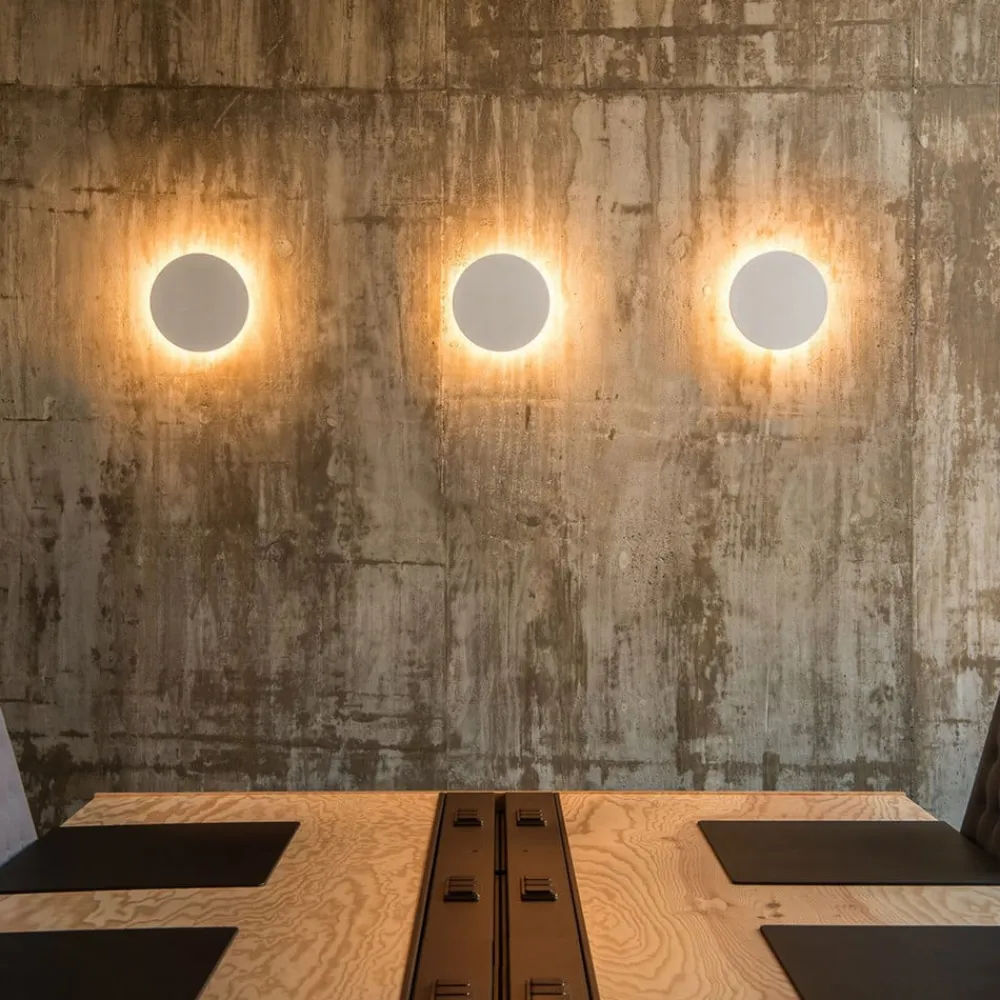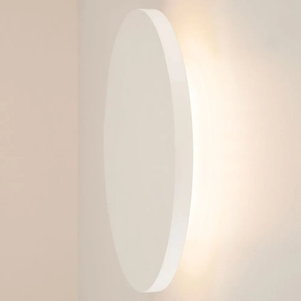 Indirekte oplyst Plastra LED-væglampe – rund Plastra LED-væglampen tiltrækker opmærksomhed med sit varmhvide, indirekte lys. Den kan monteres på væggen eller i loftet og giver en stemningsfuld belysning alle steder. Det udsendte lys skaber en vidunderlig koronaeffekt på væggen. Plastra-væglampen er et absolut blikfang i sig selv og kan også arrangeres i en række for at oplyse et større rum eller en længere korridor – lavet af gips: kan males over og tilpasses