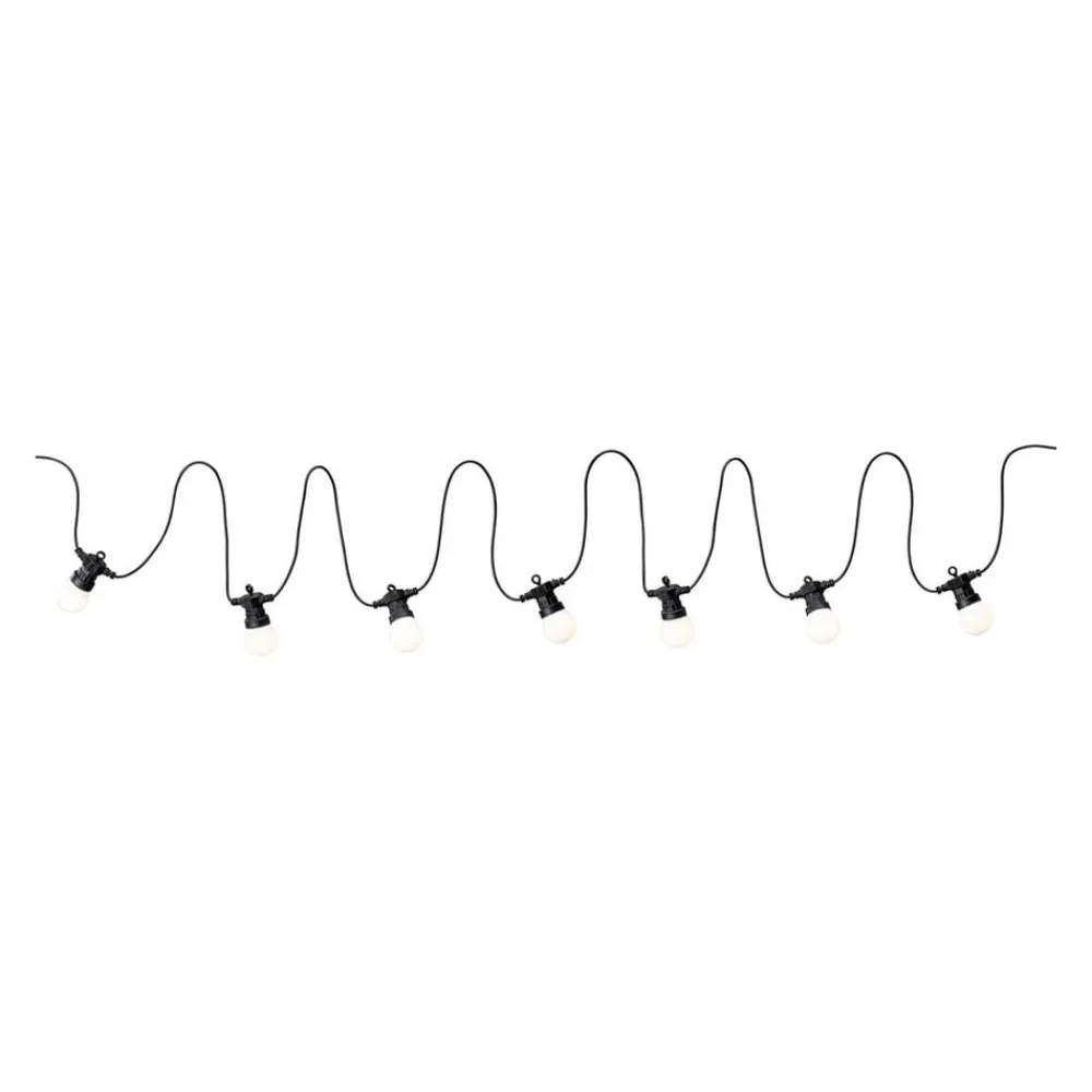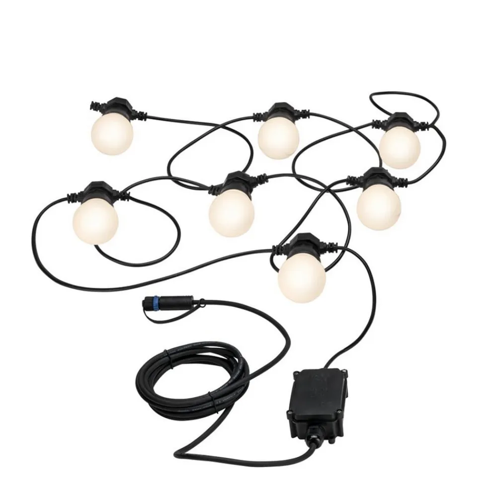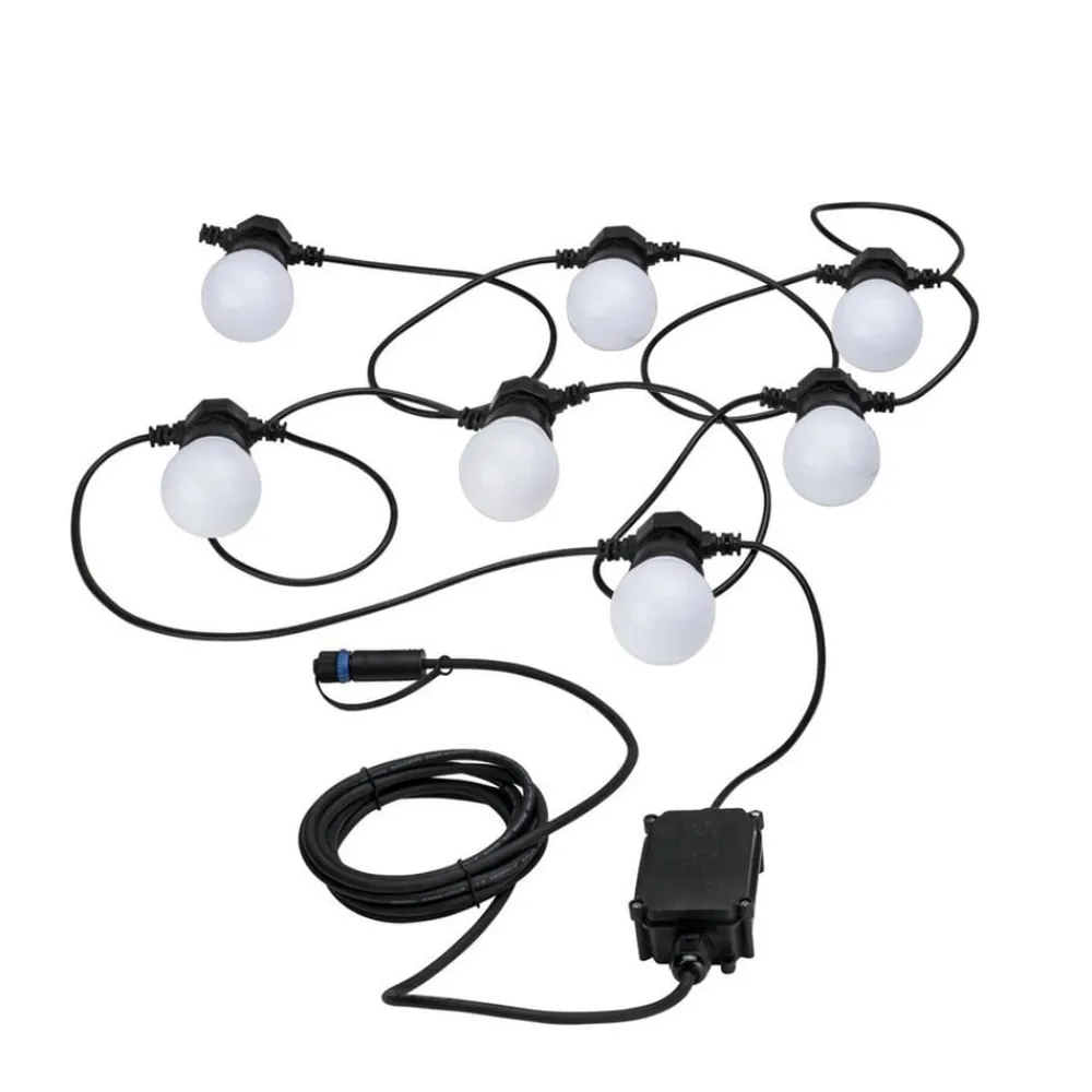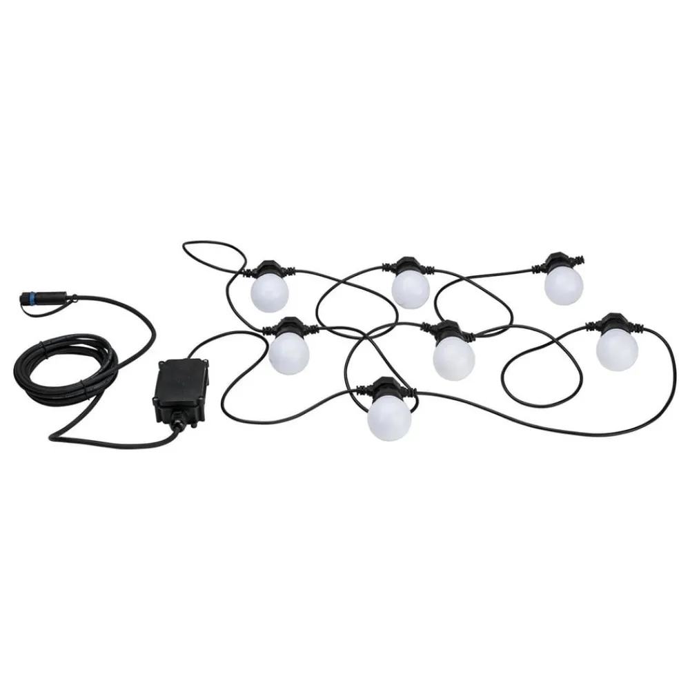 Syvdelt lyskæde Plug & Shine til dekorativ belysning Denne lyskæde kan bruges til at skabe stemningsfulde lysdekorationer på terrasser, i forhaver, på pergolaer og træer. Den er udstyret med syv traditionelle glødepærer med fastmonterede LED’er. Kablet og huset er sort. Lyskæden kan placeres fleksibelt udendørs ved hjælp af forlængerledninger (se tilbehør) – Med en driftsspænding på 24 V og vandbeskyttede kabler, tilslutninger og lamper er Plug & Shine fra Paulmann en alsidig og sikker belysningsløsning til udendørs brug.