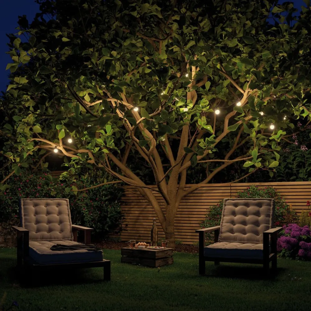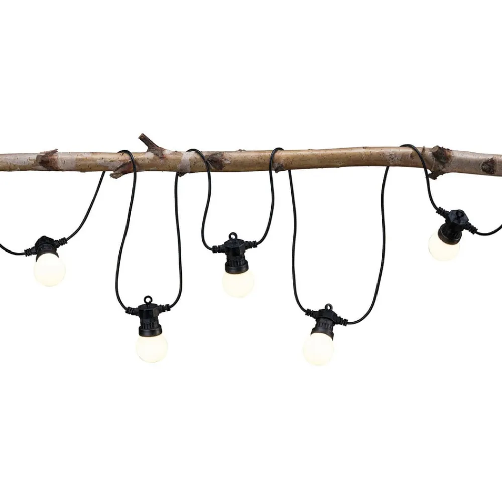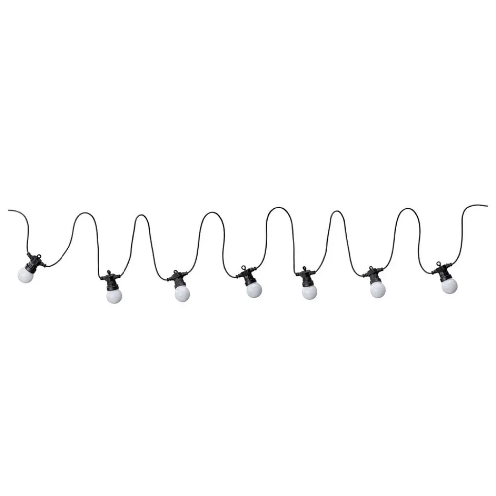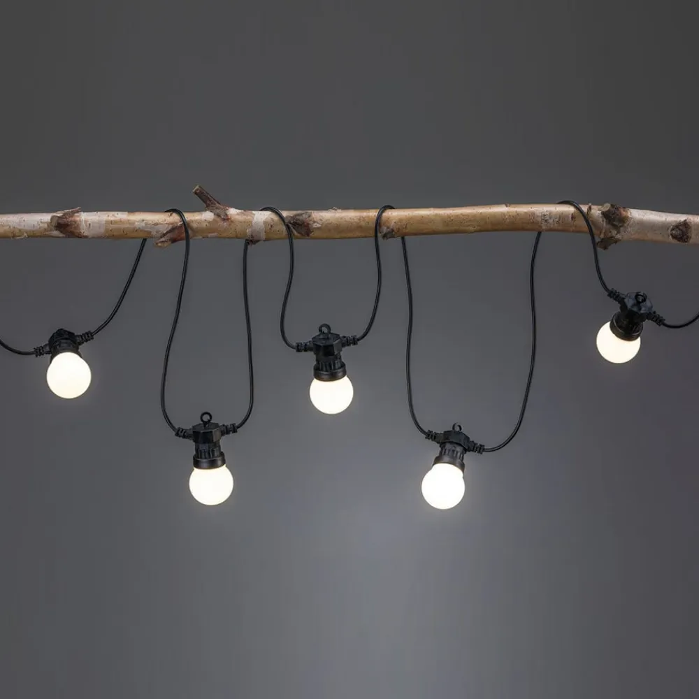 Syvdelt lyskæde Plug & Shine til dekorativ belysning Denne lyskæde kan bruges til at skabe stemningsfulde lysdekorationer på terrasser, i forhaver, på pergolaer og træer. Den er udstyret med syv traditionelle glødepærer med fastmonterede LED’er. Kablet og huset er sort. Lyskæden kan placeres fleksibelt udendørs ved hjælp af forlængerledninger (se tilbehør) – Med en driftsspænding på 24 V og vandbeskyttede kabler, tilslutninger og lamper er Plug & Shine fra Paulmann en alsidig og sikker belysningsløsning til udendørs brug.