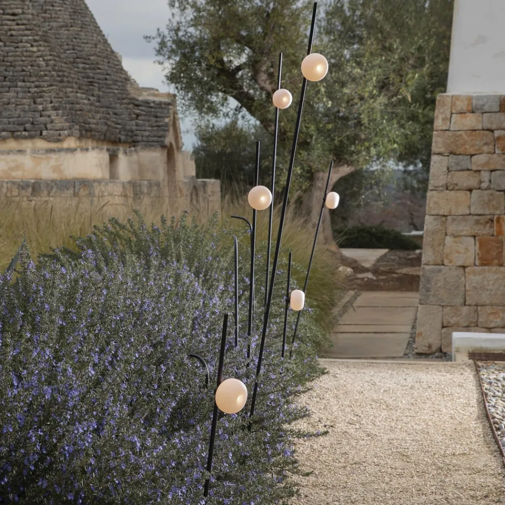 LED-spottelampen Pois har et yndefuldt og formfuldendt design fra designeren Matteo Ugolini og sikrer en stemningsfuld belysning i ethvert udendørs område. Den hvide lampeskærm af fin kunstharpiks minder i sin optik og sit organiske design om en blomst, der troner på en yndefuld stilk, eller, når mørket falder på, om en ildflue på opdagelsesrejse.