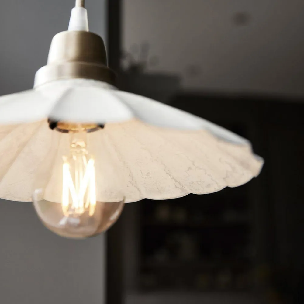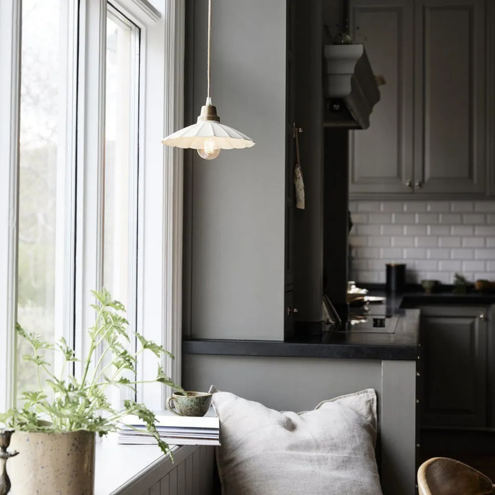 Den runde, åbne lampeskærm på hængelampen Ester i jern har en farvet emaljeret finish. Kombineret med de messingfarvede detaljer over lampeskærmen skaber det en lampe med en tiltalende vintage charme. Strømforsyningen sker direkte via en stikkontakt; hængelampen Ester er derfor udstyret med et stik med fastgørelseskroge.
