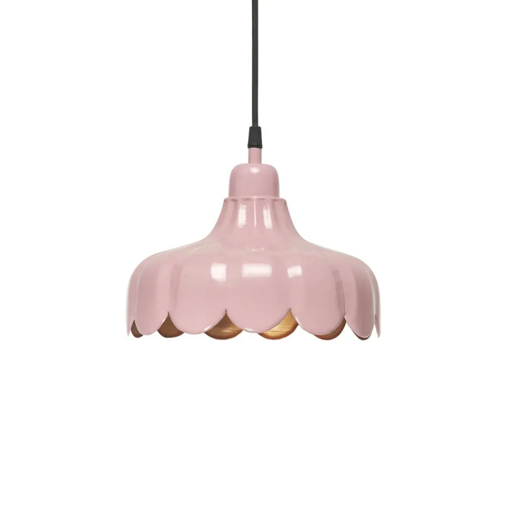 Wells pendellampe med metalskærm i blomsterlook, monteret med stik Wells pendellampen består af et tekstilophæng og en metalskærm med guldfarvet inderside. Skærmen er håndlavet og har et blomstret design. Den giver et romantisk strejf til stuen og er samtidig en smuk dekorativ detalje. Den guldfarvede inderside reflekterer lyset og skaber en særlig varm glød. Wells-pendlen er ideel til belysning af f.eks. stue- eller spisebordet eller køkkenbordet. Lyskilden er ikke inkluderet og kan vælges frit. Takket være det lange stik leveres strømmen via stikkontakten.