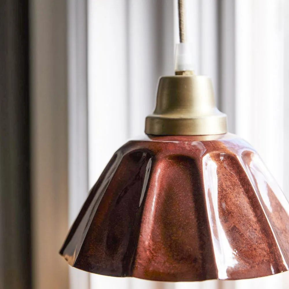 Den runde, åbne lampeskærm på hængelampen Ester i jern har en farvet emaljeret finish. Kombineret med de messingfarvede detaljer over lampeskærmen skaber det en lampe med en tiltalende vintage charme. Strømforsyningen sker direkte via en stikkontakt; hængelampen Ester er derfor udstyret med et stik med fastgørelseskroge.