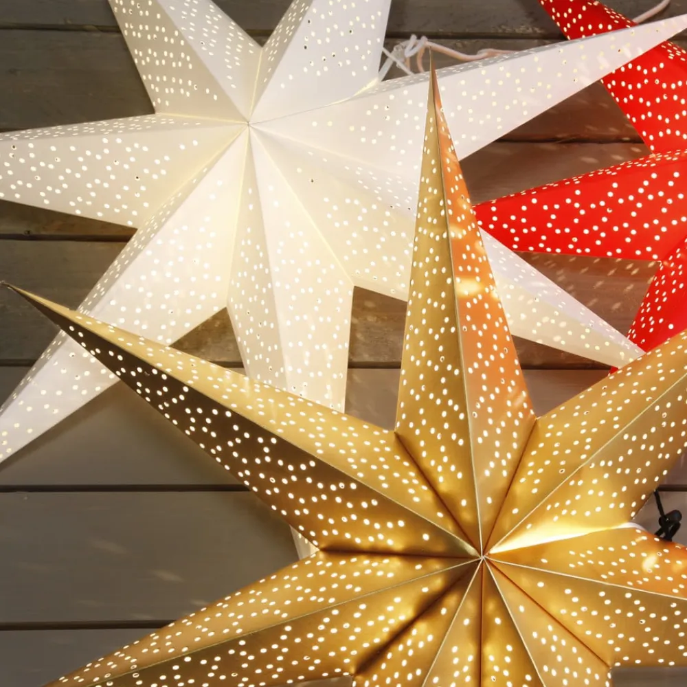 Hvid papirstjerne Dot med indviklet hulmønsterDot er det helt rigtige dekorative tilbehør til advents- og juletiden. Den store, syvtakkede stjerne af hvidt papir er dækket af et fint hulmønster, der giver en effektiv lysstemning, når lysene tændes. Papirstjernen Dot tilføjer en stemningsfuld festlig atmosfære til ethvert rum.