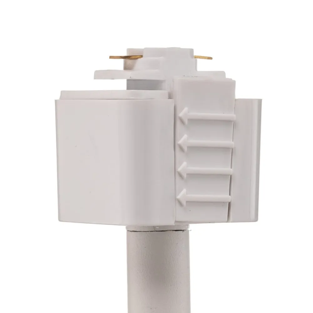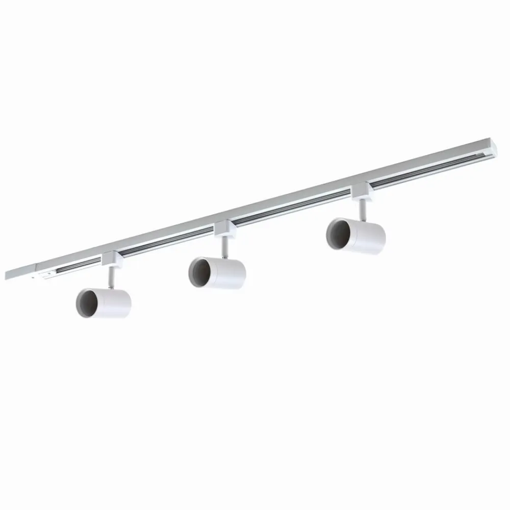 Jorell komplet 3 lyskilder skinnesystem med hvidt spotlight Dette kompakte skinnesystem kan bruges enkeltvis eller i forlængelse af hinanden. Det har en 1 meter lang 1-faset skinne og er udstyret med tre cylindriske spotlights, der kan justeres efter behov. Disse kan udstyres med reflektorpærer efter eget valg. Der er lamper med en bredere eller smallere udstrålingsvinkel, alt efter om man ønsker en målrettet og punktformet belysning eller ønsker at oplyse rummet over et større område. Den hvide farve ser tidløs ud, og det samme gør spotlightenes cylindriske form. Skinnesystemet kan enten bruges i et privat miljø eller til kommerciel butiksbelysning. Den har en strømforsyning og en endestop, så den er klar til brug med det samme.