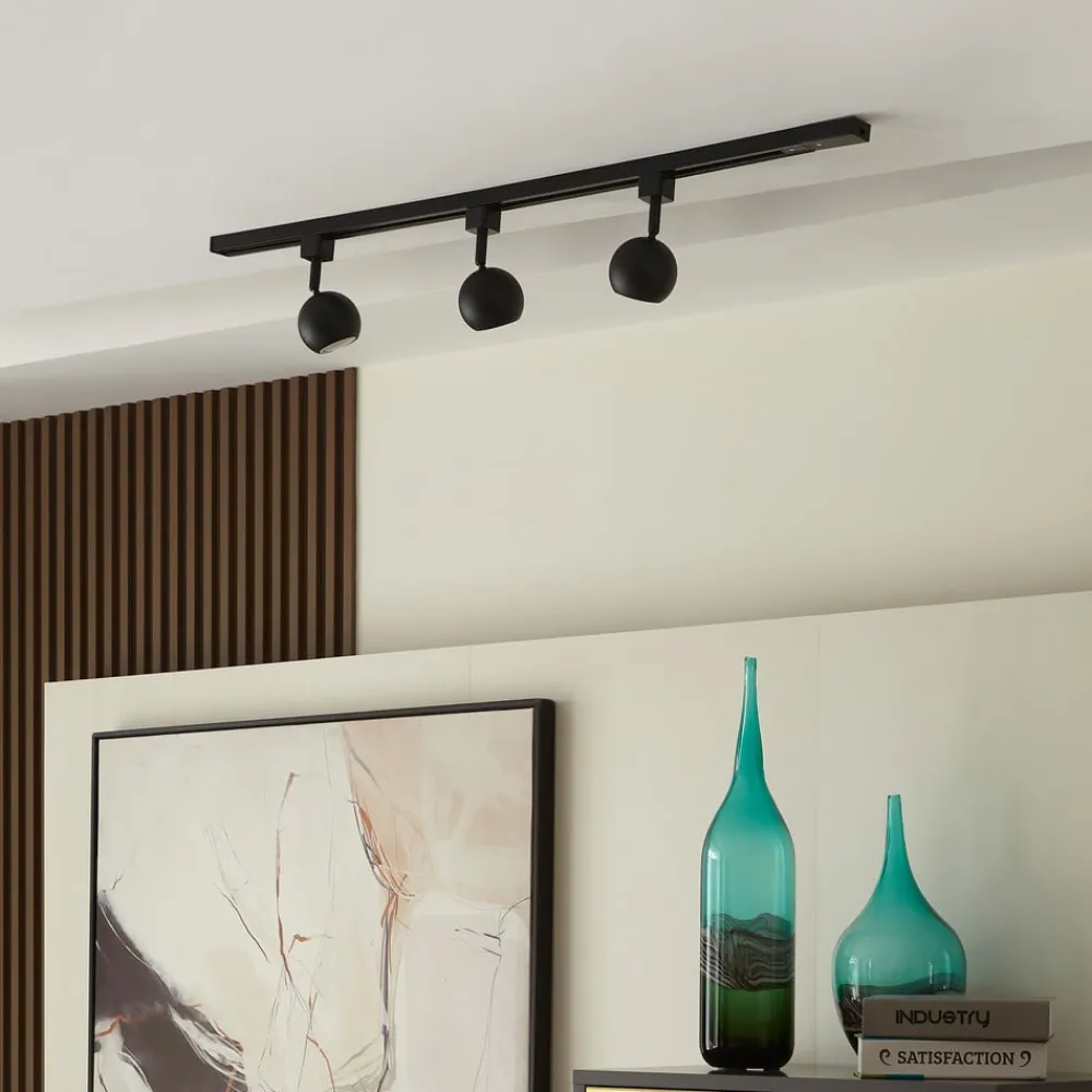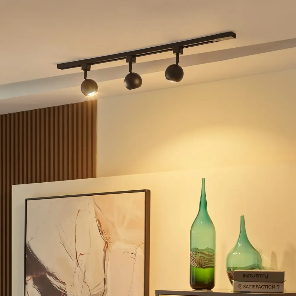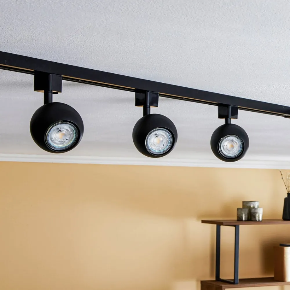 Felipo 3 lyskilder med sorte kugleskærme og 1-fase skinne Felipo kan bruges både kommercielt og privat og er et komplet skinnesystem, der kan bruges uafhængigt af hinanden og også kan udvides, hvis det er nødvendigt. Ligesom de tre kugleformede skærme er skinnen sort og har derfor et markant udseende, der nemt kan integreres i moderne eller teknisk interiør. Skærmene kan drejes og svinges og kan udstyres med reflektorpærer efter eget valg. Der findes f.eks. lamper med bred eller smal og spotformet lysudstråling – det hele afhænger af, hvilket formål armaturet skal opfylde. I en stue kan det for eksempel være, at du ønsker at give en grundlæggende belysning, mens butiksbelysning kan være mere fokuseret på at belyse specifikke objekter. Felipos skinnesystem har en strømtilførsel og en endekappe.