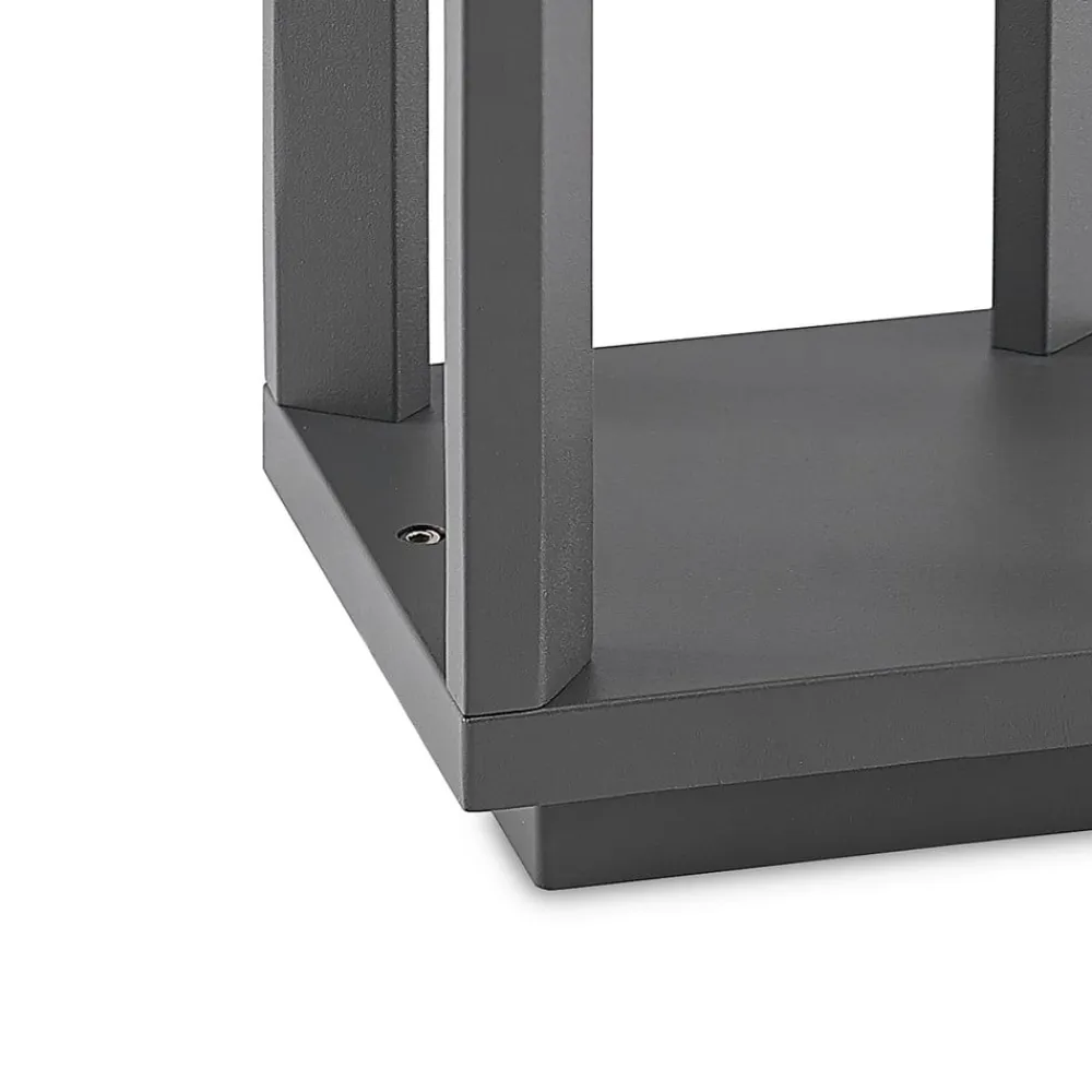 Moderne LED-gadelampe Gamion med kantet look Denne LED-gadelampe er særlig effektiv i årets mørke måneder, når den installeres i en række med flere lamper langs havestien. Når man kommer hjem om aftenen, vil man gerne blive mødt af et behageligt og varmt lys. Det giver Gamion LED-gadelampen med sit varmhvide lys, som er meget behageligt og indbydende. Det mørke og åbne design med slanke stivere passer perfekt ind i moderne omgivelser.