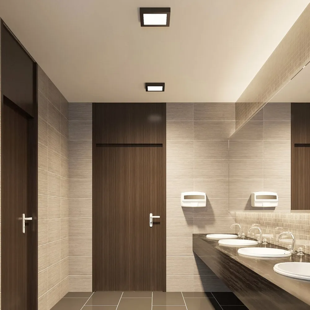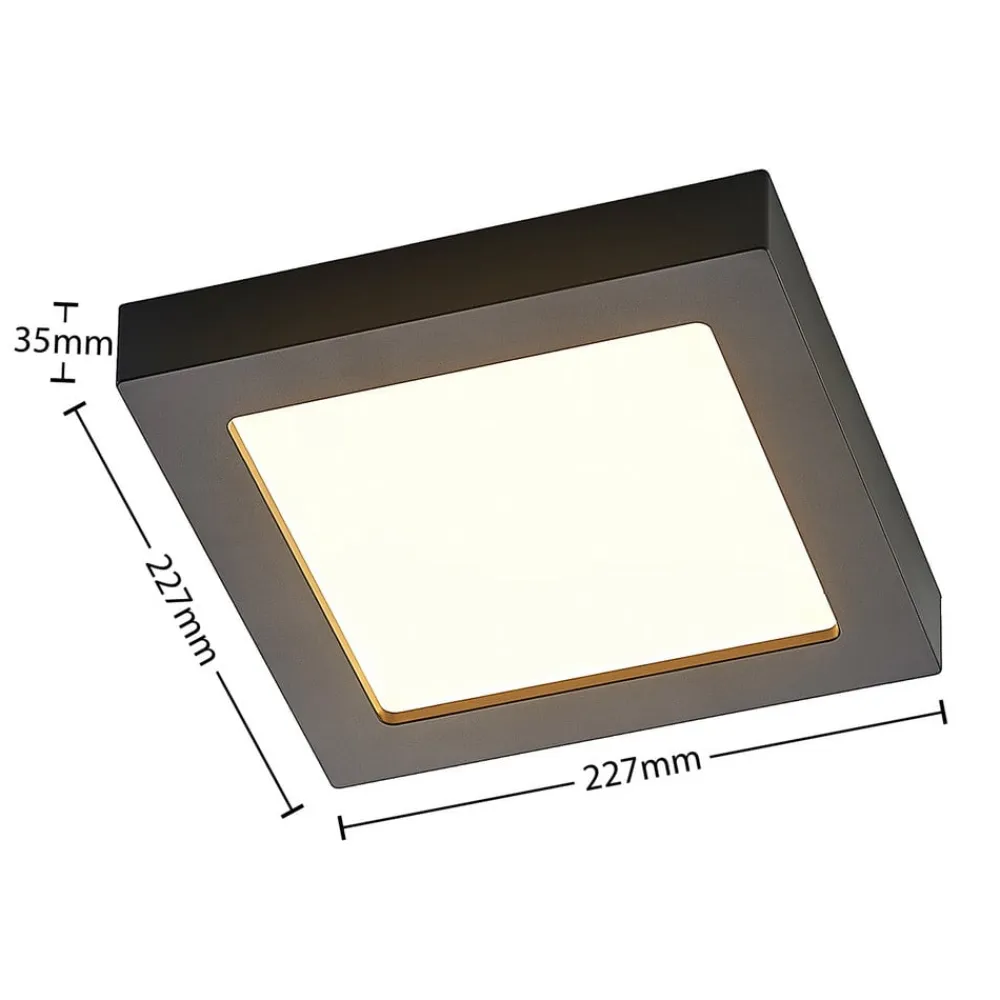Firkantet LED-loftslampe Alette med CCT og lysdæmperfunktion, IP44 LED-loftslampen Alette er fremstillet af aluminium og plast. Det kantede hus er dekoreret med en sort overfladefinish og har et slående og moderne udseende. Designet kan integreres i forskellige indretninger og ser meget stilfuldt ud. Lysstyrken på denne lampe kan justeres individuelt ved hjælp af en ekstern lysdæmper (leading edge phase control). Der er også en DIP-kontakt på huset, som kan bruges til at justere lysfarven på forhånd i flere trin (3.000 K, 4.000 K og 6.000 K). Den har også en IP44-beskyttelsesgrad, hvilket betyder, at lampen også kan bruges i et badeværelse. Den er velegnet til brug i både den private og kommercielle sektor. Tekniske data: – Dæmpbar (leading edge phase control) – CCT-funktion via DIP-switch: 3.000 K / 4.000 K / 6.000 K – IP44-beskyttelsesklasse – 120° strålevinkel