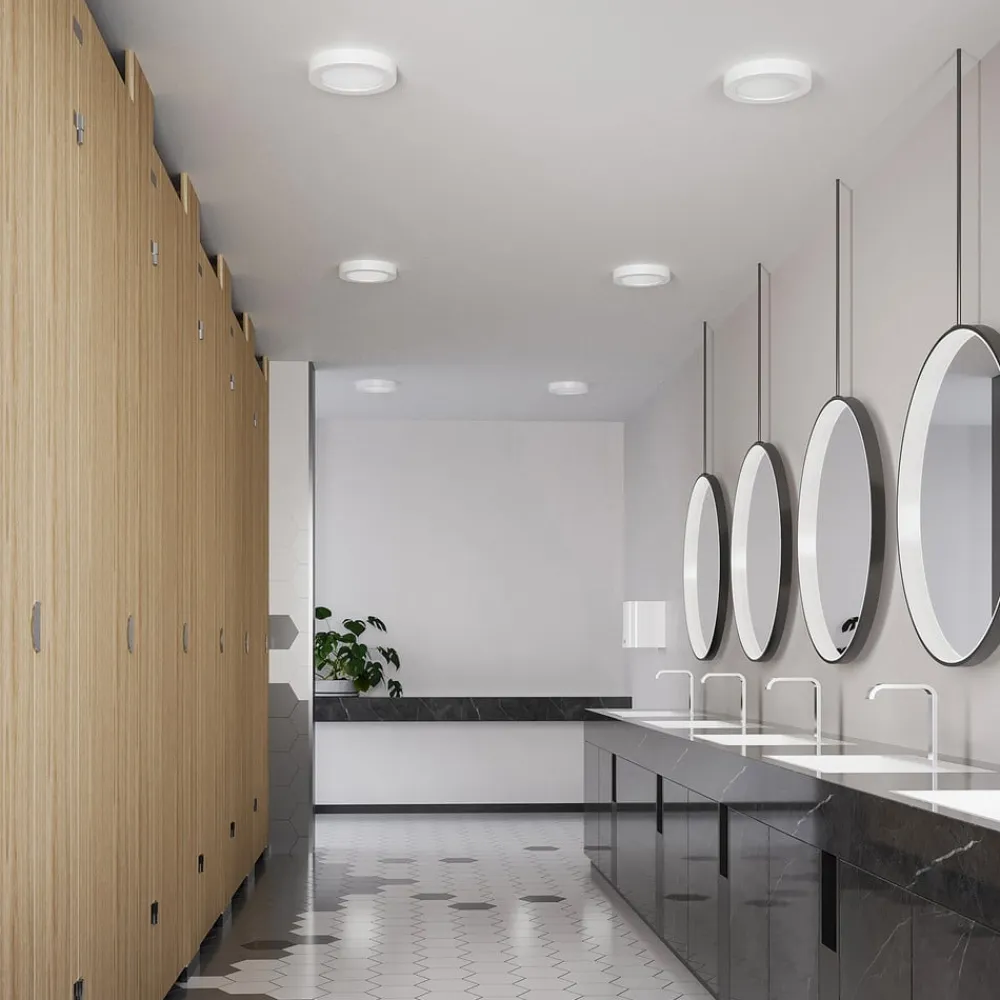 Edwina rund LED-loftlampe med forindstillelig lysfarve, IP44 Denne loftlampe med sine fastmonterede LED’er er en enkel lyskilde til utallige lejligheder, som kan bruges både privat og kommercielt. Den runde form og det hvide overfladedesign er særligt tidløst, og Edwina er også teknisk velegnet til mange steder og anvendelser, da lysfarven kan forudindstilles før installation ved hjælp af en integreret DIP-kontakt på huset, og kapslingsgraden gør det også muligt at bruge den i vådrum, da LED-loftlampen er tilstrækkeligt forseglet til at forhindre, at der kommer vandsprøjt ind. Med den brede strålevinkel kan større områder også belyses godt, og lysstyrken kan også justeres via en ekstern dæmper, hvis det er nødvendigt – IP44, til badeværelser og fugtige rum – Lysfarve kan forudindstilles via DIP-kontakt