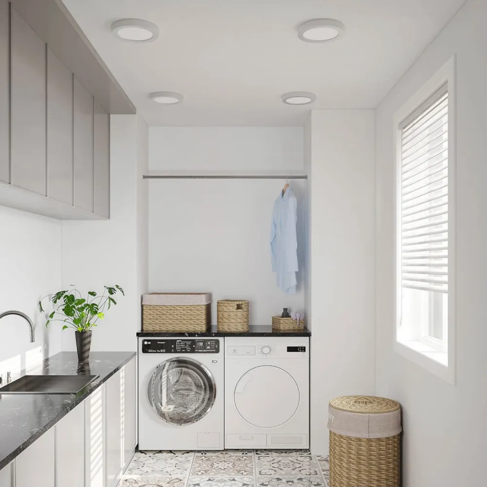 Edwina rund LED-loftlampe med sølvfarvet ramme og kapslingsgrad IP44, forudindstillelig lysfarve – i praktisk sæt med 2 stk. Denne LED-loftlampe med fastmonterede lysdioder er en klassisk allrounder til mange lejligheder. Med en DIP-kontakt på huset kan man vælge en af tre lysfarver før installation – alt efter hvad der passer bedst til stedet og formålet. LED’erne giver stærkt lys med lavt strømforbrug og er derfor særligt effektive. Hvis det er nødvendigt, kan lysintensiteten justeres ved hjælp af en ekstern dæmper. Derudover giver kapslingsgraden IP44 god beskyttelse mod fugt, hvilket betyder, at Edwina også kan bruges til at oplyse fugtige rum. LED-loftlampen kan bruges godt i både kommercielle og private omgivelser, og det runde design med sølvramme fremstår behageligt diskret og alsidigt. – forudindstillelig lysfarve (DIP-kontakt) – kapslingsgrad IP44 til badeværelser og fugtige rum – eksternt dæmpbar – armaturet leveres i et sæt med 2 stk
