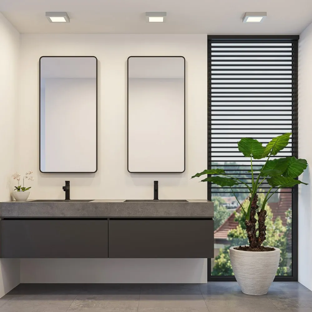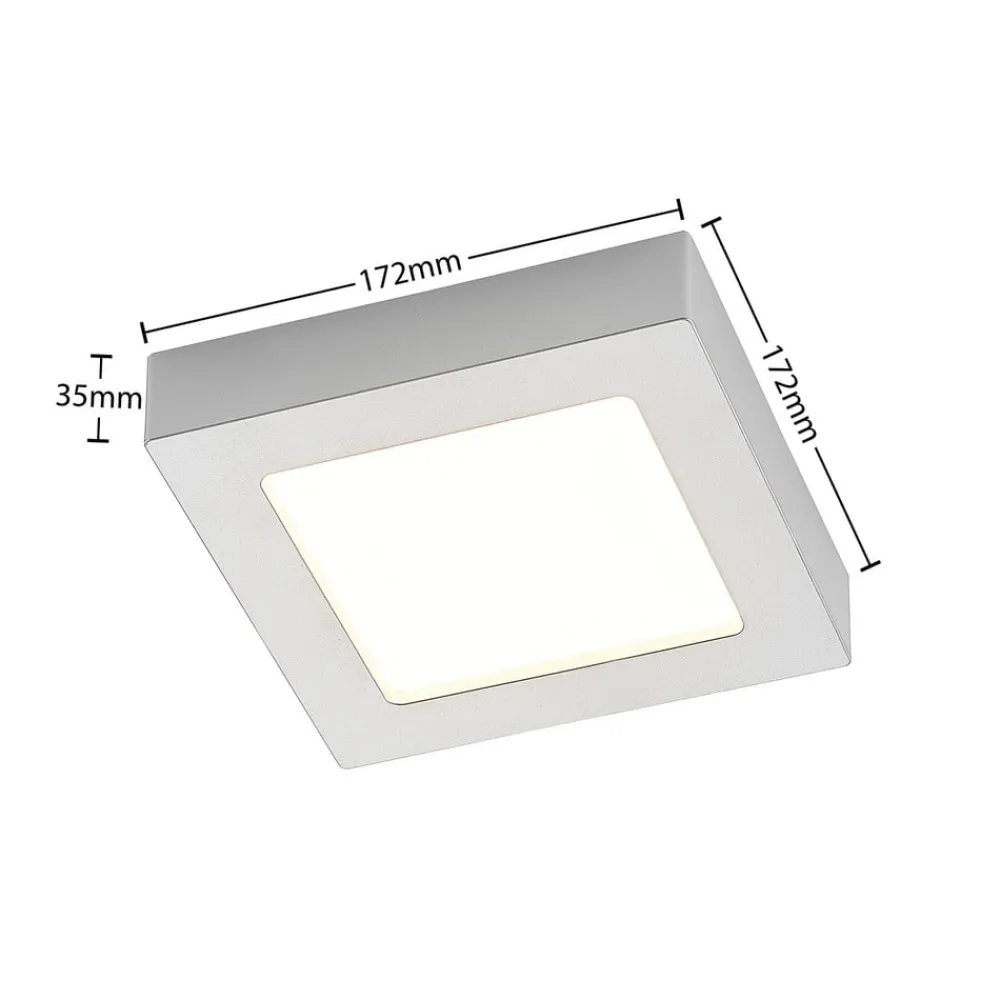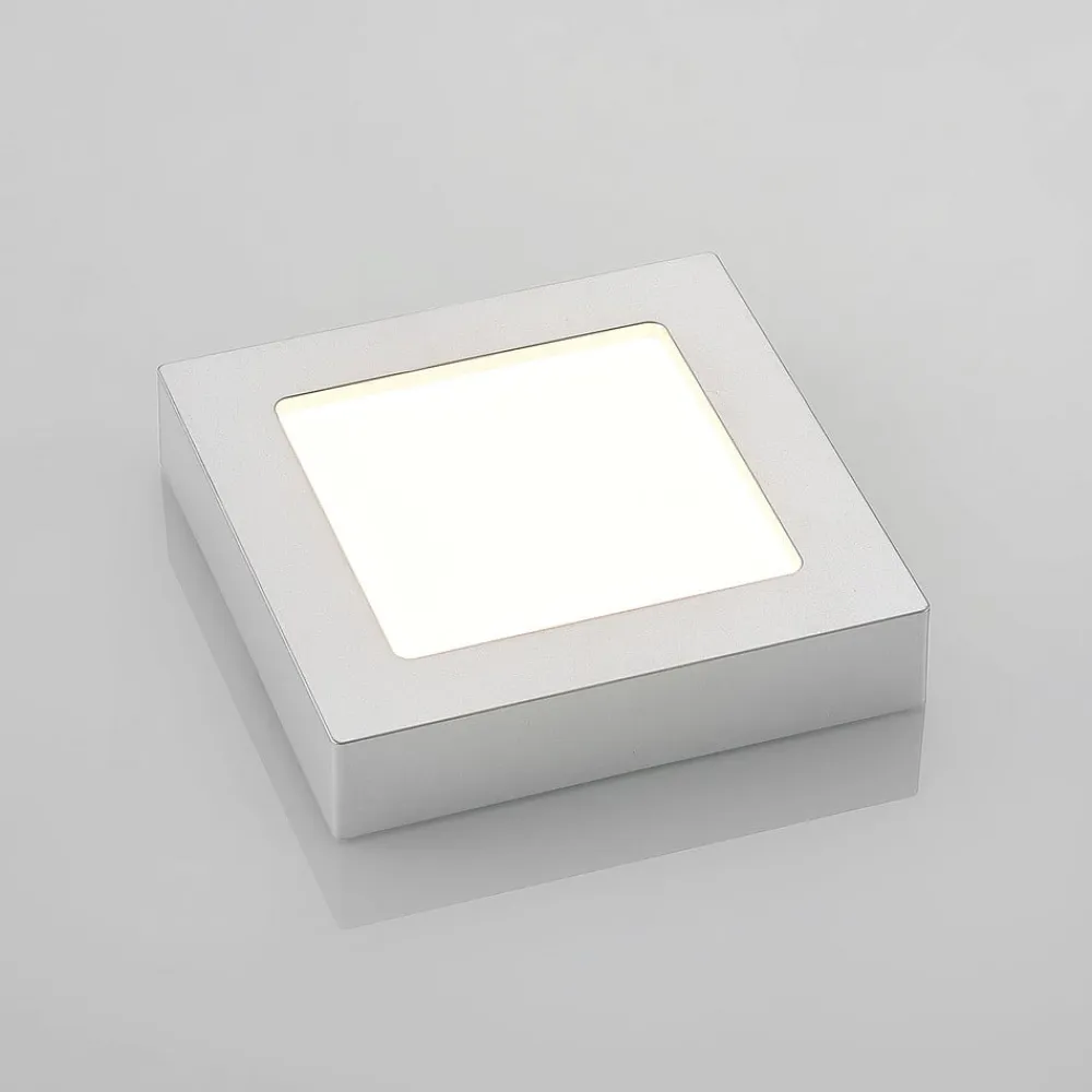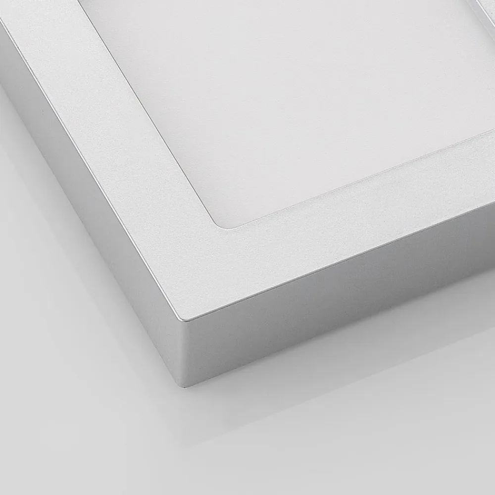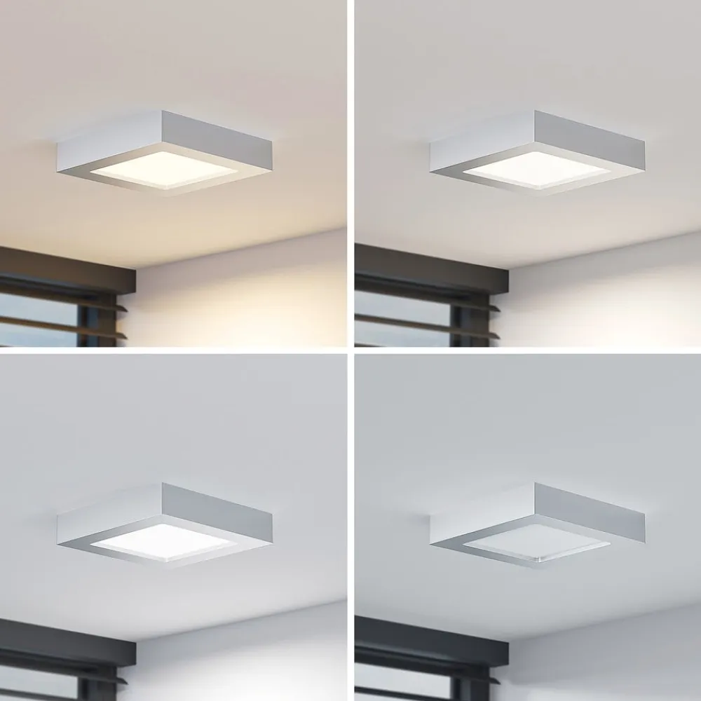 Sølvfarvet indrammet LED-fugttæt loftslampe Alette med forudindstillelig lysfarve, dæmpbar Alette er en lyskilde, der med sit enkle og relativt tidløse design kan bruges i en lang række miljøer. Grundformen er kvadratisk, og huset er malet i sølv. Derudover betyder IP44-beskyttelsesgraden, at den også kan bruges i badeværelser uden tøven, og lysfarven kan indstilles ved hjælp af DIP-kontakten – placeret på huset – som kan indstilles til tre positioner før installationen. For at fuldende udvalget af funktioner kan LED-lysets lysstyrke justeres eksternt. Med sine egenskaber kan den vinklede loftslampe bruges både til privat brug og i kommercielle miljøer. – Lysstyrken kan justeres med en ekstern lysdæmper – IP44, til fugtige rum – DIP-kontakt til valg af lysfarve før installation