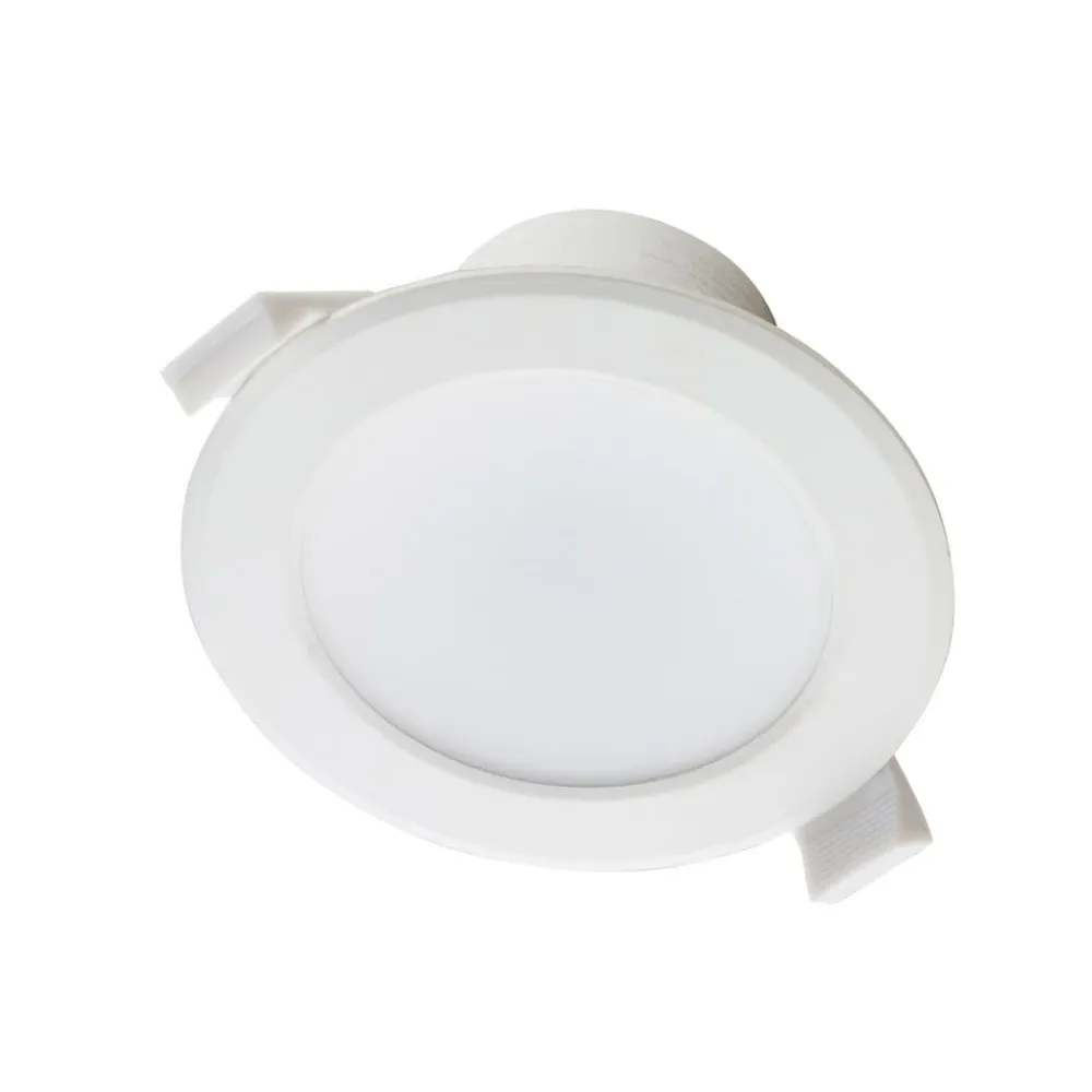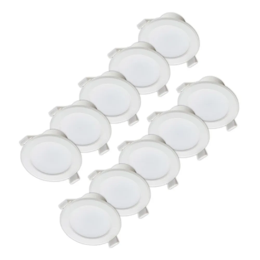 Hvid LED-indbygningsspot Rida i rund form, lysfarve kan justeres før installation via DIP-kontakt, IP44, sæt med 10 stk. Rida scorer med god funktionalitet og er en lyskilde til mange formål, uanset om du vil bruge LED-indbygningslampen privat eller erhvervsmæssigt. Armaturhuset er rundt og hvidt, hvilket gør det usædvanligt enkelt og tidløst, hvilket taler for dets alsidige brug. Takket være den brede strålevinkel kan et rum belyses over et større område, men i større rum er det stadig tilrådeligt at bruge flere armaturer for at opnå optimale belysningsresultater. Den høje kapslingsgrad betyder, at LED-indbygningsspottet er godt beskyttet mod fugt og fugt og derfor også uden tøven kan bruges i badeværelser eller andre fugtige rum. Du skal først beslutte dig for en lysfarve under installationen, så kan du vælge en af tre farvetemperaturer via en DIP-kontakt og derefter installere armaturet. Rida kan også dæmpes eksternt, hvis en tilsvarende dæmper leveres via husinstallationen og kan bruges. Lysstyrken på de permanent installerede LED’er kan derefter justeres efter behov – Kapslingsgrad IP44 til brug i fugtige rum – Lysfarven kan indstilles via DIP-kontakten før installationen – Bred strålevinkel på 100° – Leveres i et praktisk sæt med 10 stk
