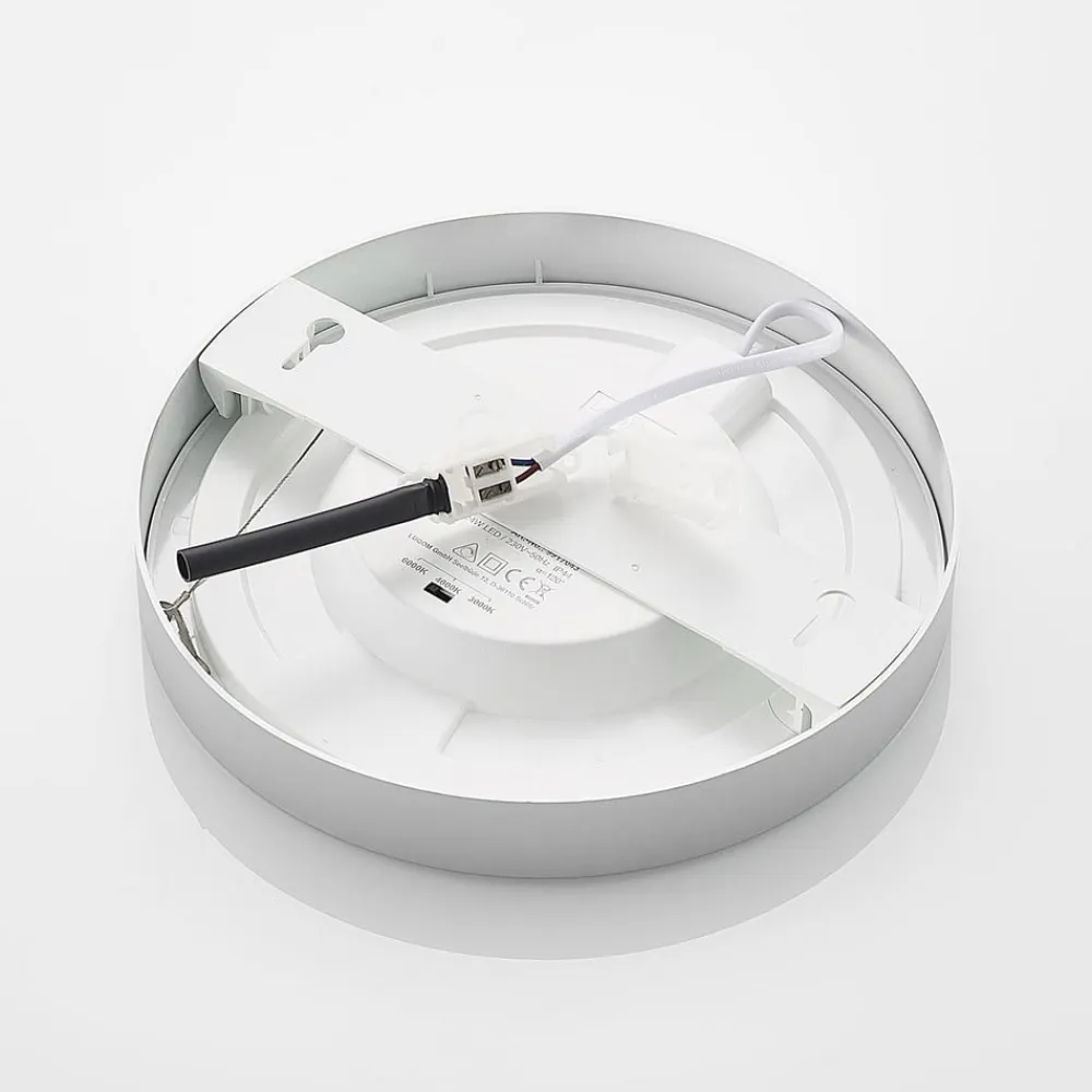 Rundt LED-loftlampe Edwina med sølvramme og kapslingsklasse IP44, lysfarve forudindstilles