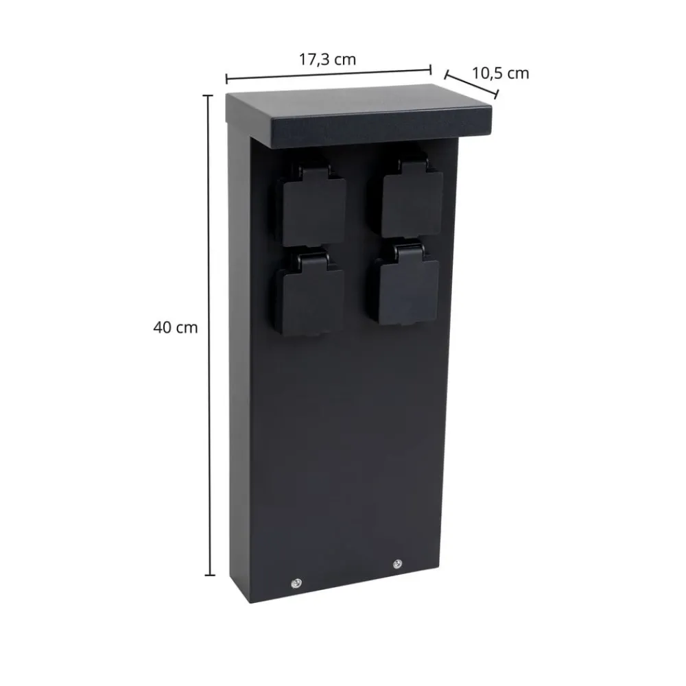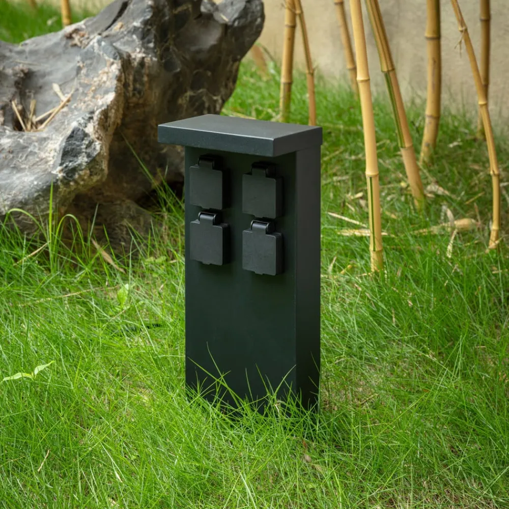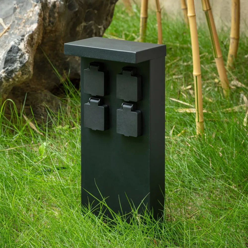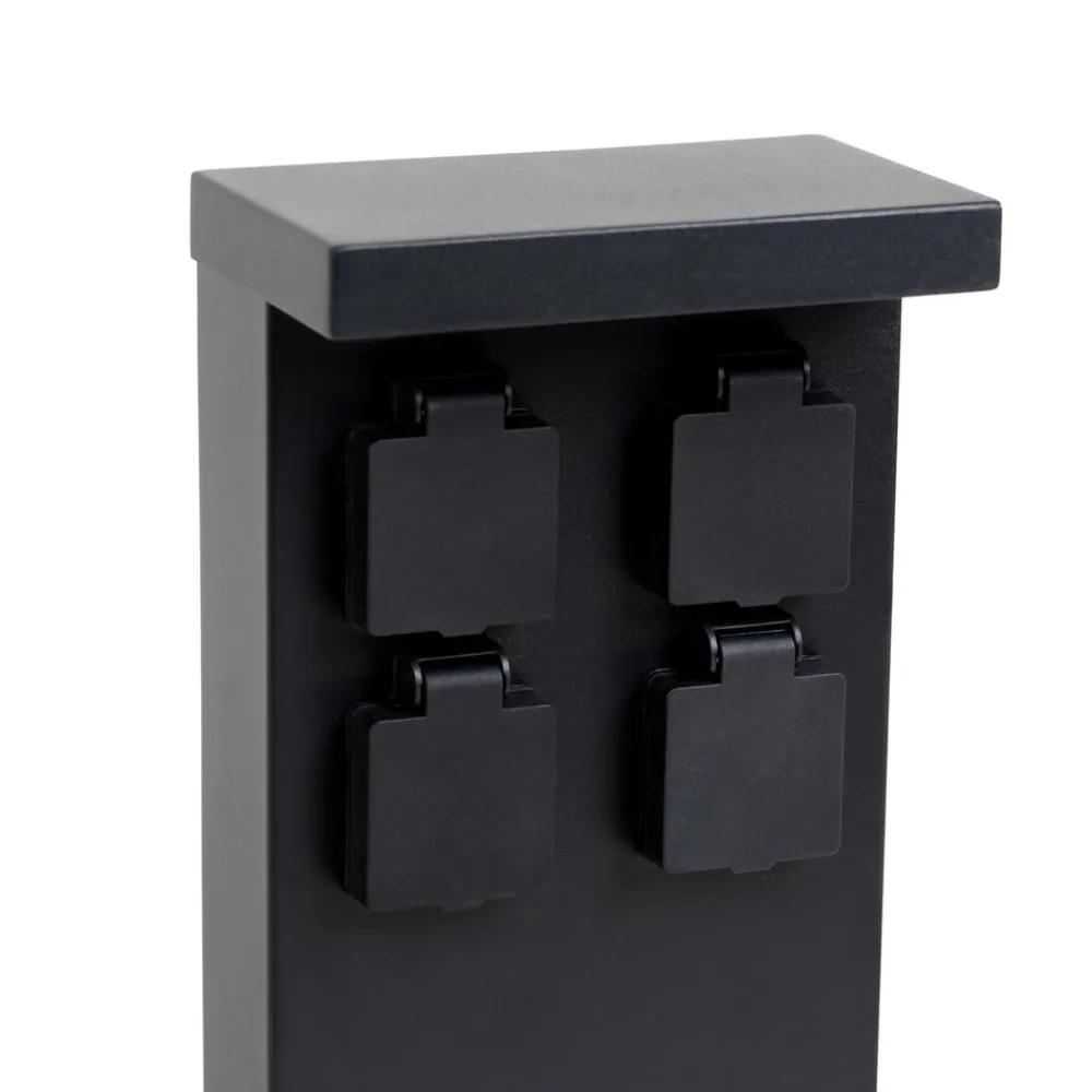 Sort stikkontaktsøjle i rustfrit stål Mariel med 4 stikkontakter Denne markant designede og meget moderne udseende stikkontaktsøjle er en passende tilføjelse til miljøer med moderne arkitektur, hvor den pålideligt giver fire stikkontakter, der kan bruges med forskellige enheder. For at beskytte strømtilslutningen er der en klap over hver stikkontakt, som lukker den sikkert, når den ikke er i brug. Mariel-stikkontaktsøjlen kan bruges til at drive mange elektriske apparater udendørs, for eksempel en støvsuger, når bilen skal rengøres indefra, eller en lyskæde til at give stemningsfuld belysning rundt om huset sommer og vinter – 4 x CEE 7/3 (max. 16A/max. 3600 W)