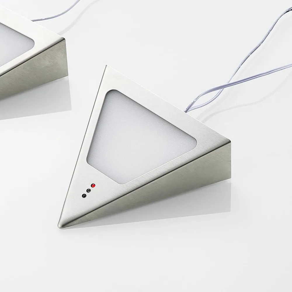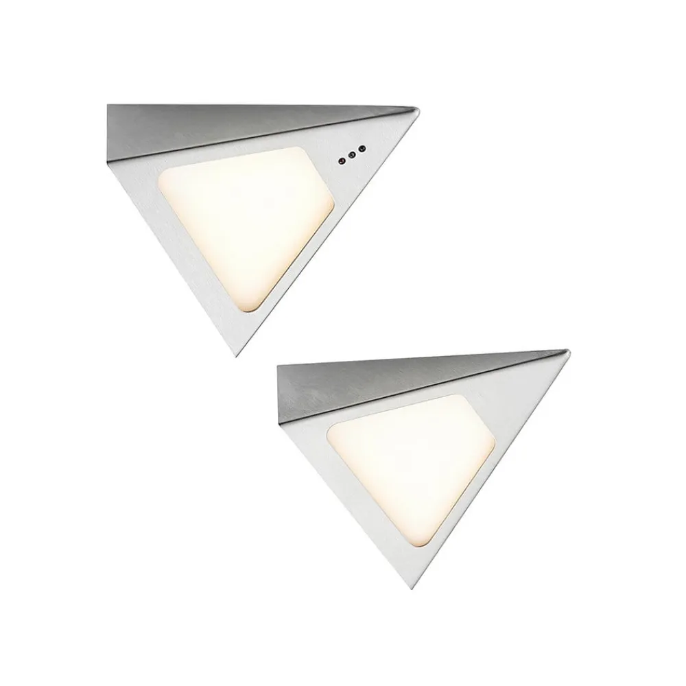 LED-underskabsbelysningen Odia består af to lamper, der er forbundet med hinanden via et kabel. Hvis et møbel skal sættes i et særligt lys, er denne lampe det perfekte valg. Inde i de pyramideformede elementer sidder LED’er, der med deres varmhvide lys skaber en perfekt stemning. Netstikket er forbundet med et to meter langt kabel til det første element, som også er forbundet med det andet element. Kabellængden gør det muligt at placere lampen fleksibelt. LED-underskabsbelysningen Odia kan styres ved hjælp af håndbevægelser og kan tændes og slukkes ved at vinke med hånden. Ved at holde dæmperen inde er den også trinløst dæmpbar. Strømforsyningen er særlig flad, så den nemt kan monteres bag skabe.