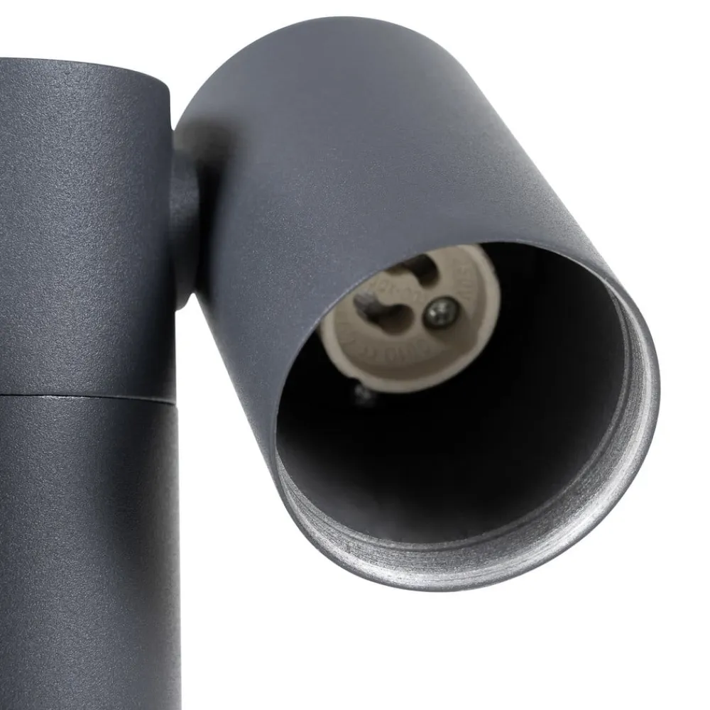 2 lyskilder Tulimar aluminium sokkellampe i mørkegråt design Tulimar sokkellampen imponerer med sit moderne udseende og de to spots, som kan flyttes på en meget praktisk måde og derfor kan lyse præcis der, hvor der er mest brug for det. Den robuste aluminiumsramme sikrer et stabilt hold på gulvet og er ikke umiddelbart iøjnefaldende. Takket være den gode kapslingsgrad er denne sokkellampe meget modstandsdygtig over for vind og vejr og kan derfor bruges udendørs i lang tid.