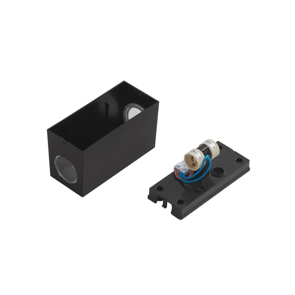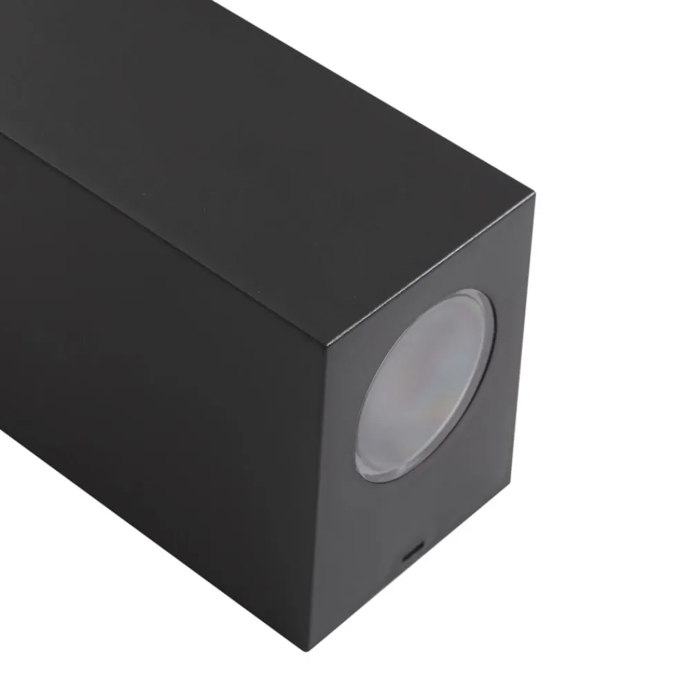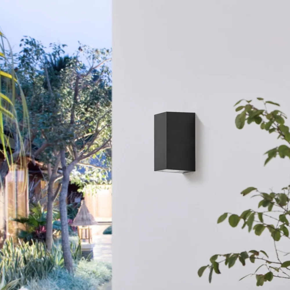 Vinkelformet udendørs væglampe Irfan med fatninger i top og bundDen, der er på udkig efter en enkel udendørs belysning, vil ikke blive skuffet over Irfan. Det diskrete armatur har en kantet krop, er fremstillet af plast og præsenterer sig i en sort farve. Den kan udstyres med to GU10-pærer, som spreder deres lys i toppen og i bunden. Irfan udendørs væglampe er beskyttet mod vandstænk, hvilket også fremgår af IP44-beskyttelsesgraden.