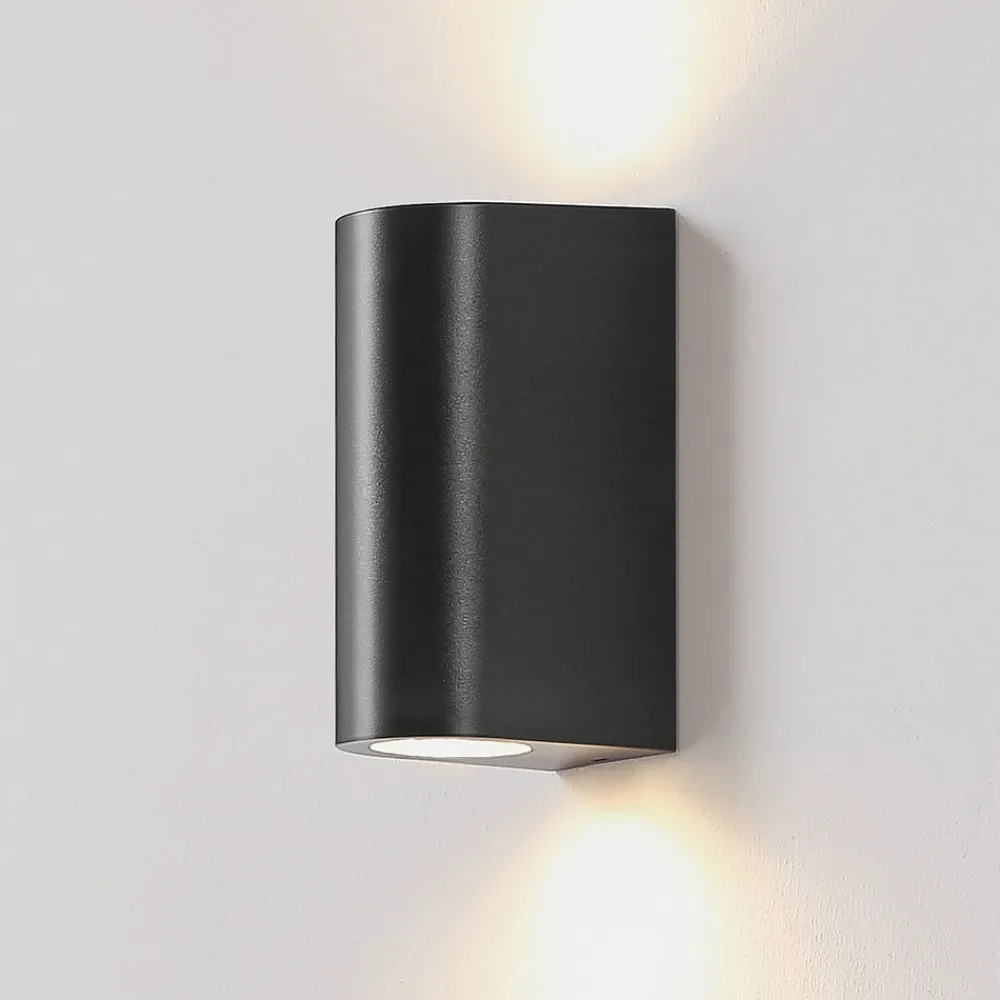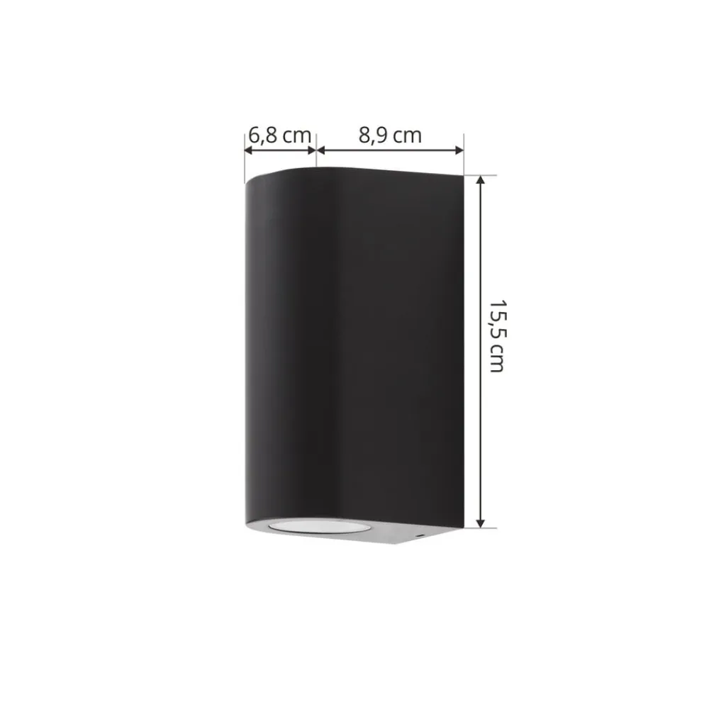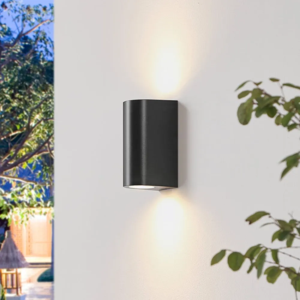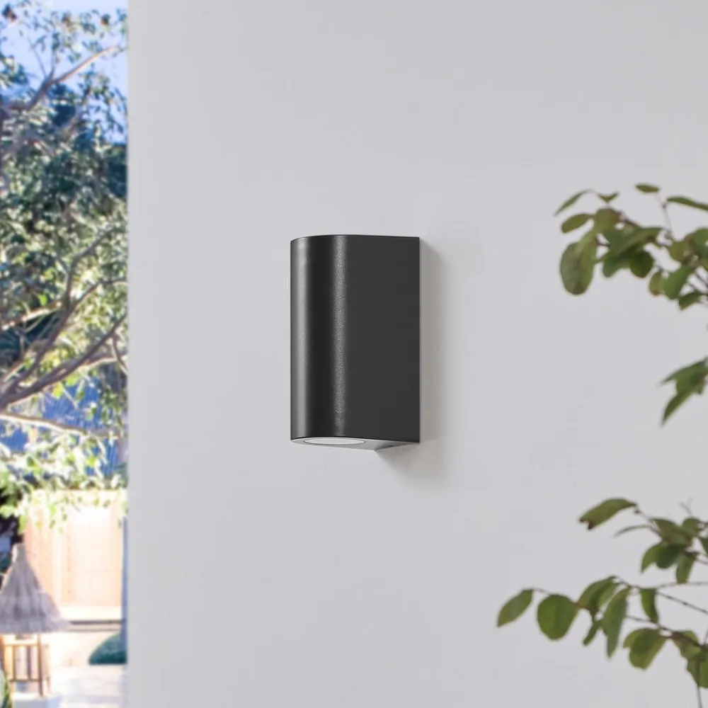 Rund væglampe Irfan – en enkel ledsager til udendørsarealet Irfan præsenterer sig selv i et ret enkelt design. Dens krop er afrundet og har en fatning til en GU10-lampe på både toppen og bunden. Gennem åbningerne i toppen og spreder det genererede lys behageligt på væggen. Irfan udendørs væglampe har IP44-beskyttelsesklasse og er derfor beviseligt beskyttet mod vandstænk. Kombiner den med andre armaturer fra serien for at skabe en harmonisk atmosfære.