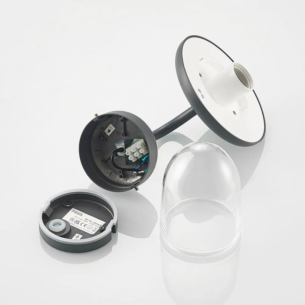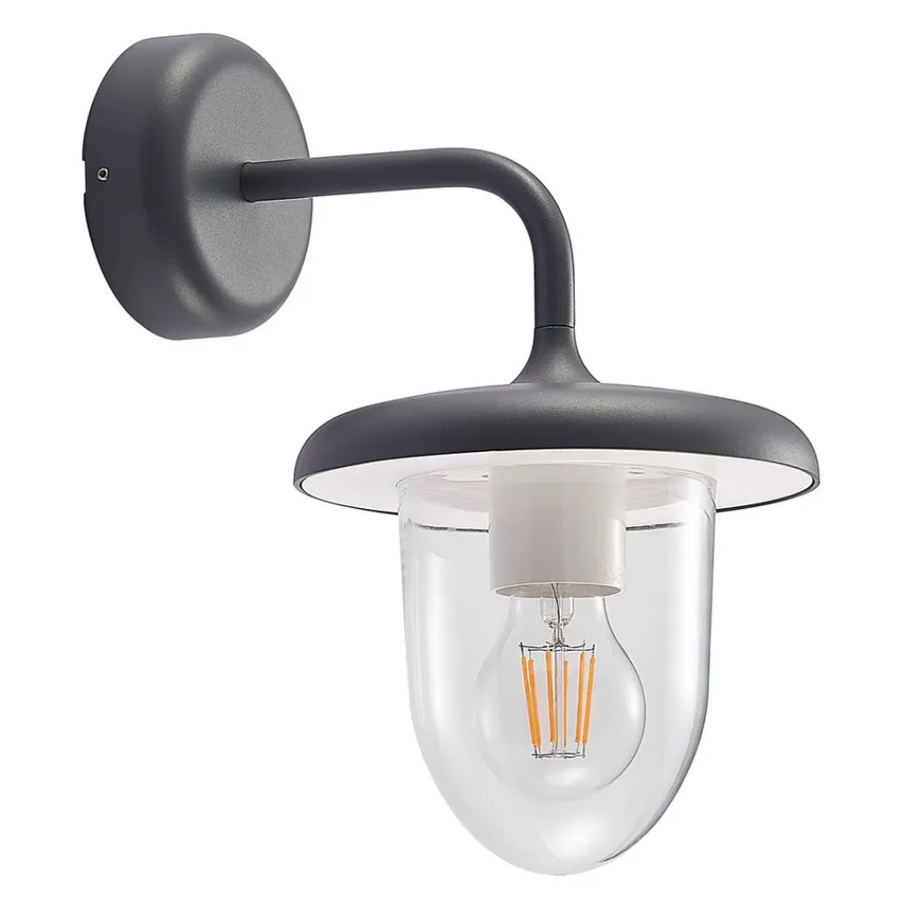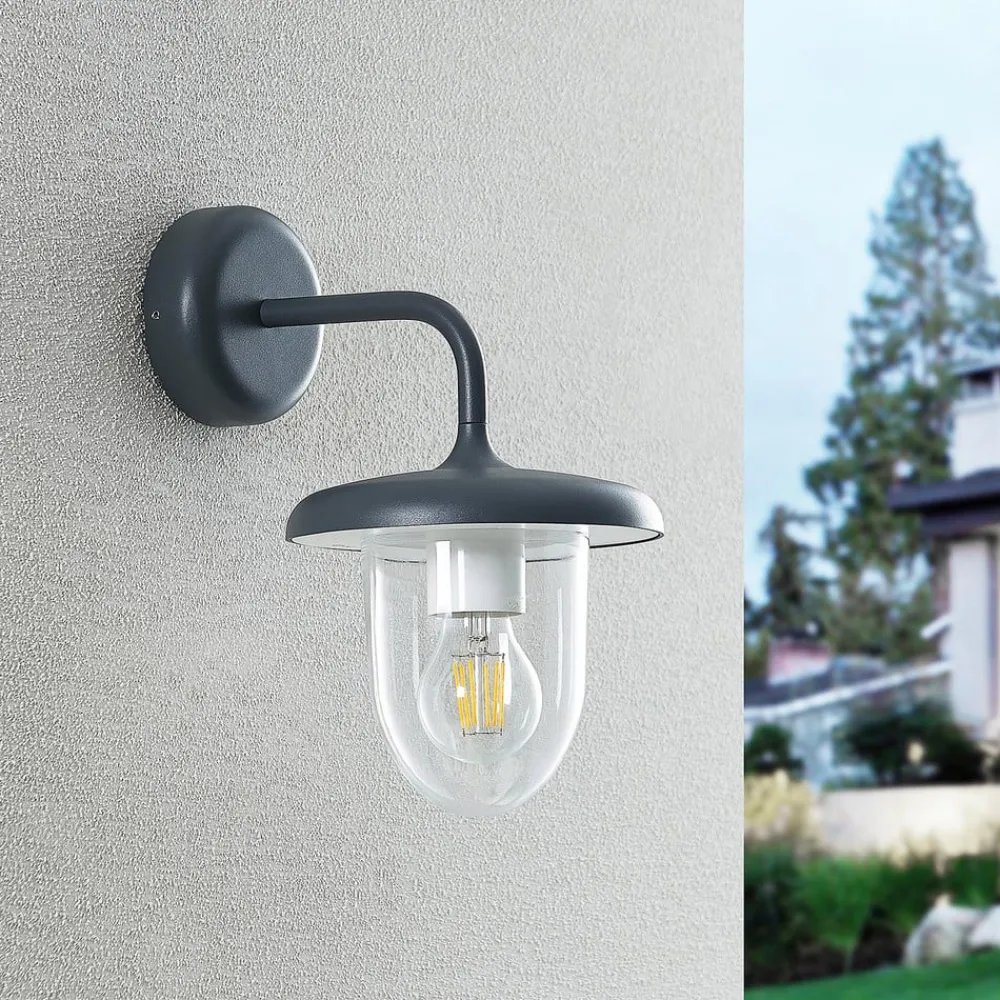 Den udendørs væglampe Larkumi har et mørkt design og er perfekt til belysning af husets indgangspartier, garager eller terrasser. Den har en velformet lampeskærm, hvorigennem brugeren har frit udsyn til den E27-pære, der skal bruges. Derfor skal pæren være passende dekorativ for at supplere armaturets særlige karakter. Den mørkegrå finish kan kombineres med mange farvekoncepter og ser elegant ud på væggen i huset.