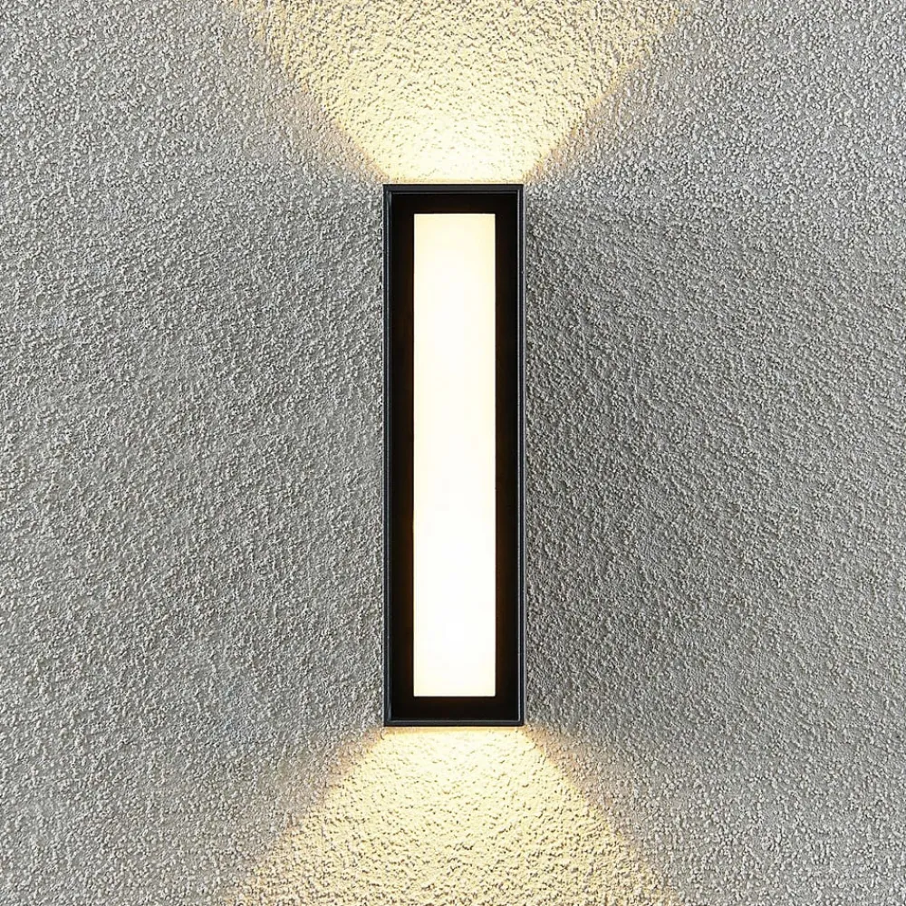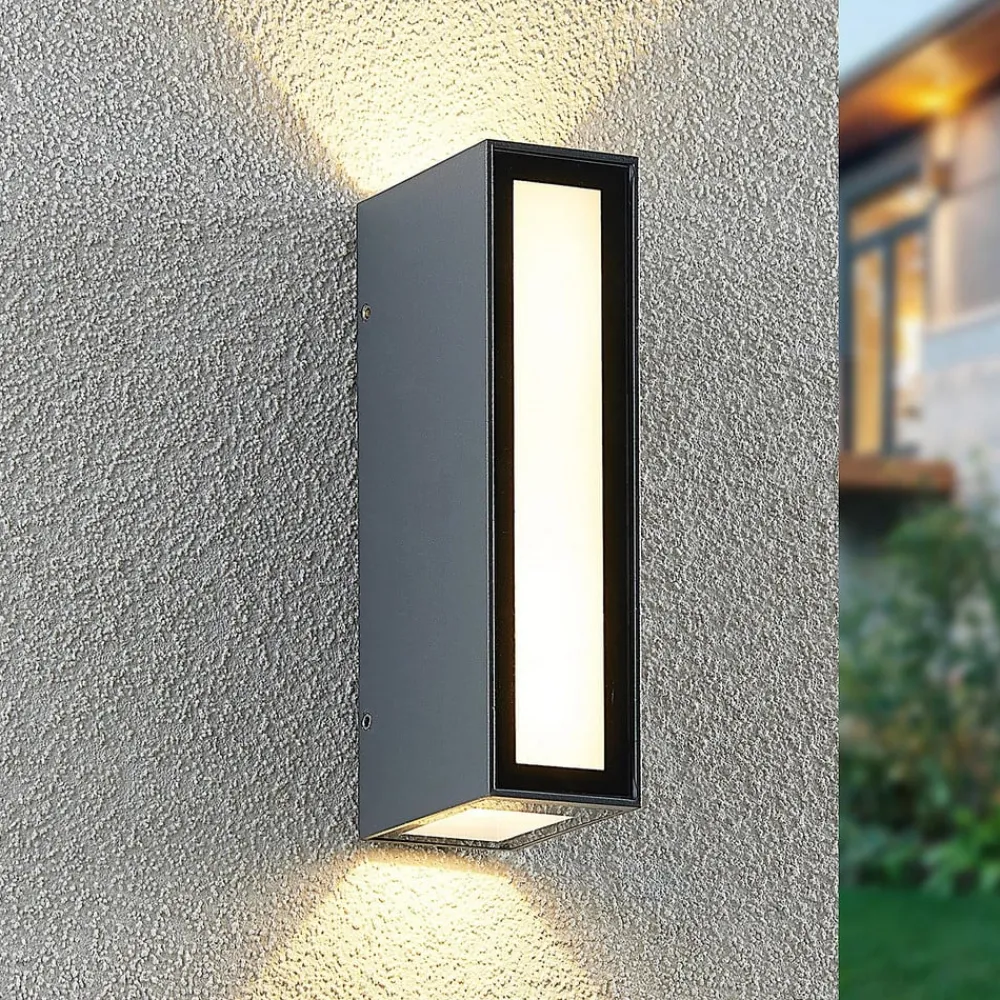 Mørk Loriava LED udendørs væglampe med flere stråleretninger Loriava LED udendørs væglampe skiller sig stilfuldt ud fra omgivelserne takket være sit karakteristiske design. Det kantede hus i trykstøbt aluminium har en mørkegrå overfladefinish og er særlig effektiv i moderne omgivelser. Armaturet udsender et varmt, hvidt lys, som er behageligt for øjet, og som fordeles i forskellige retninger uden at blænde. Loriava er en attraktiv belysningsløsning til husmure og kan også installeres i en række med flere armaturer.