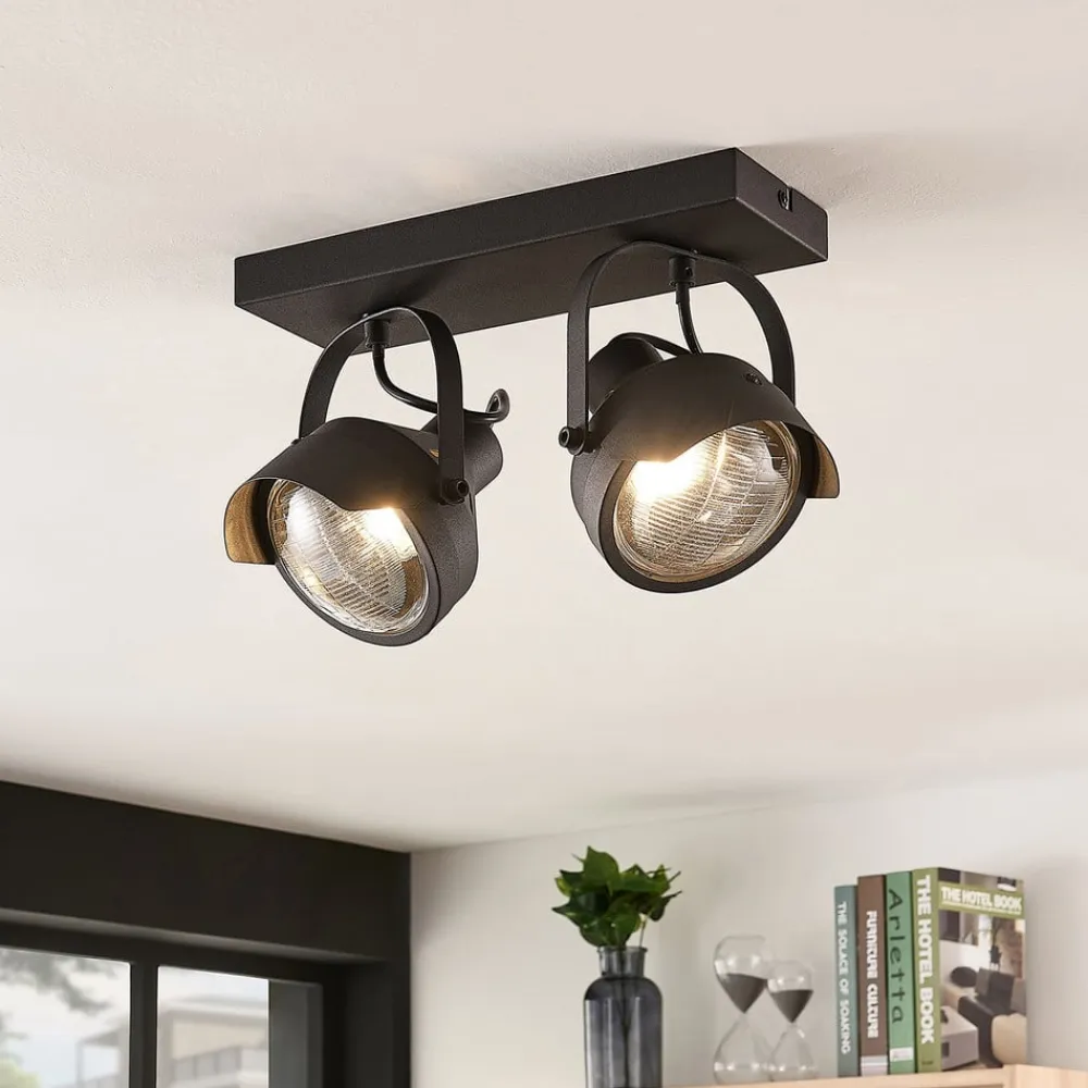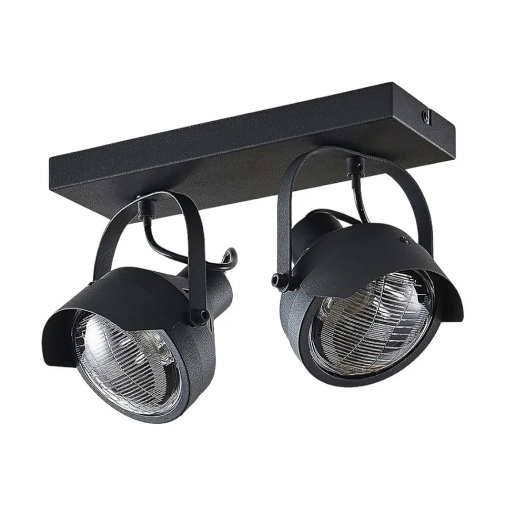 Loftlampen Henega præsenterer sig her i en udgave med to lyskilder og har to sorte lampeskærme, der minder om billygter, især dem, man kender fra de såkaldte oltimere eller veteranbiler. Således opstår der et originalt vintagelook med et helt særligt touch. Begge skærme er anbragt på stellet med led, så de kan drejes i den retning, man måtte ønske for at få en præcis oplysning af bestemte dele af rummet. Glasset, der tjener som afdækning over lyskilden, er riflet stilægte; endnu et fingerpeg i retning af gamle dage og en garant for det nostalgiske look.
