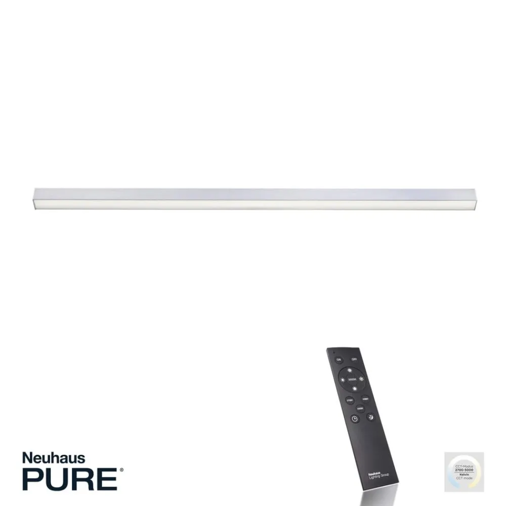 LED-loftlampe Pure-Lines tilbyder variabel justerbar belysning. Den er fremstillet i aluminium i en lang, smal form og udstyret med en diffusor af polycarbonat. Bag denne er der monteret LED’er, som kan styres meget bekvemt og utroligt fleksibelt via CCT-styringen og den medfølgende fjernbetjening. Lampen kan tændes og slukkes med fjernbetjeningen, den er dæmpbar, og lysfarven kan indstilles trinløst eller i fire faste trin. Derudover har fjernbetjening en knap til at slukke lampen efter et minut samt en knap til natlysfunktionen. Den indstillede belysning gemmes med hukommelsesfunktionen, så lampen lyser med den ønskede belysning, næste gang den tændes.