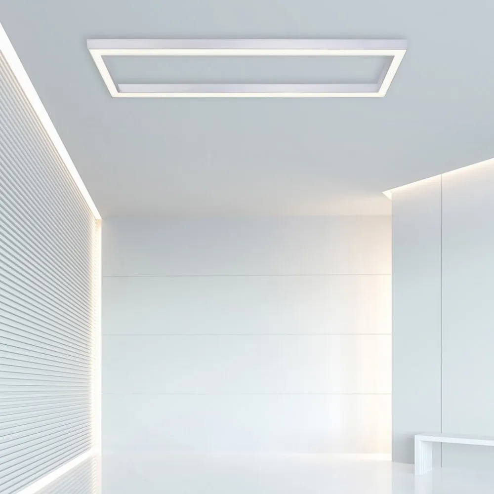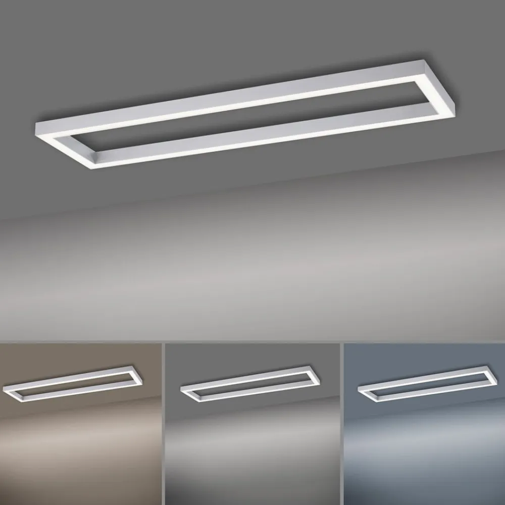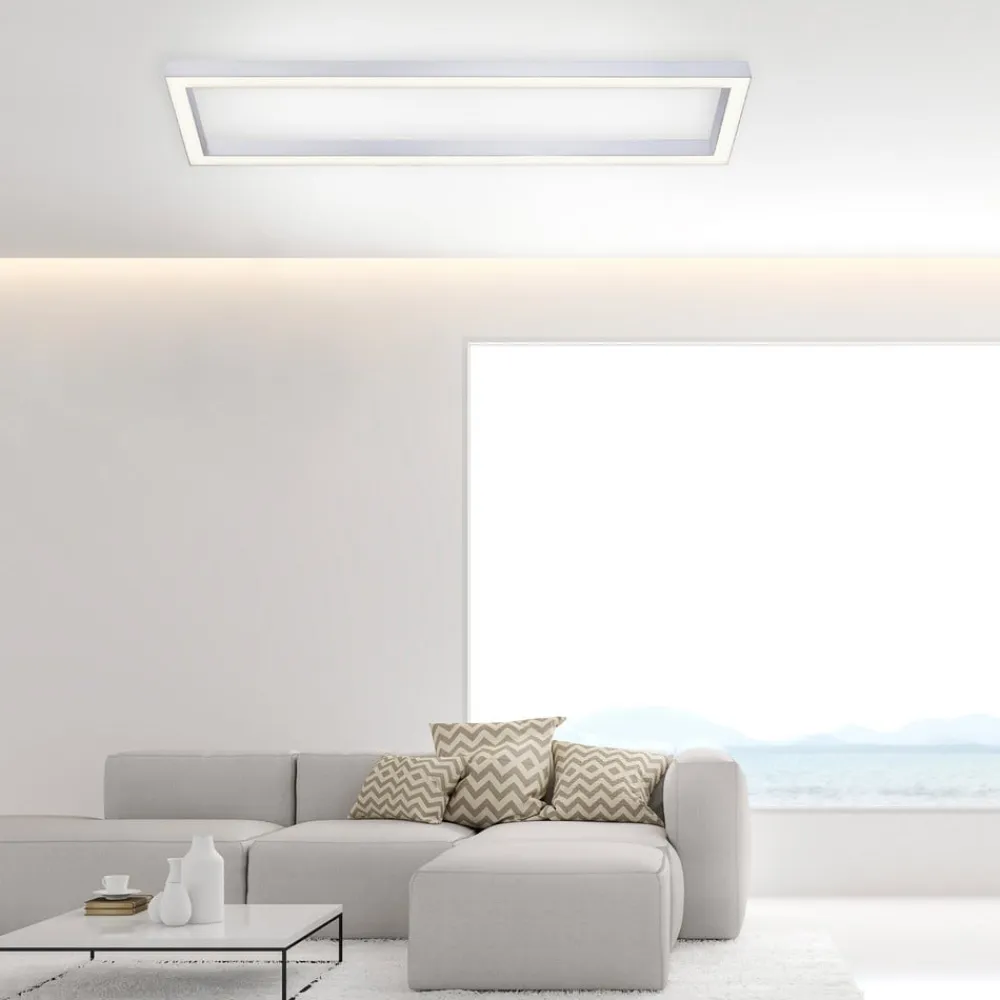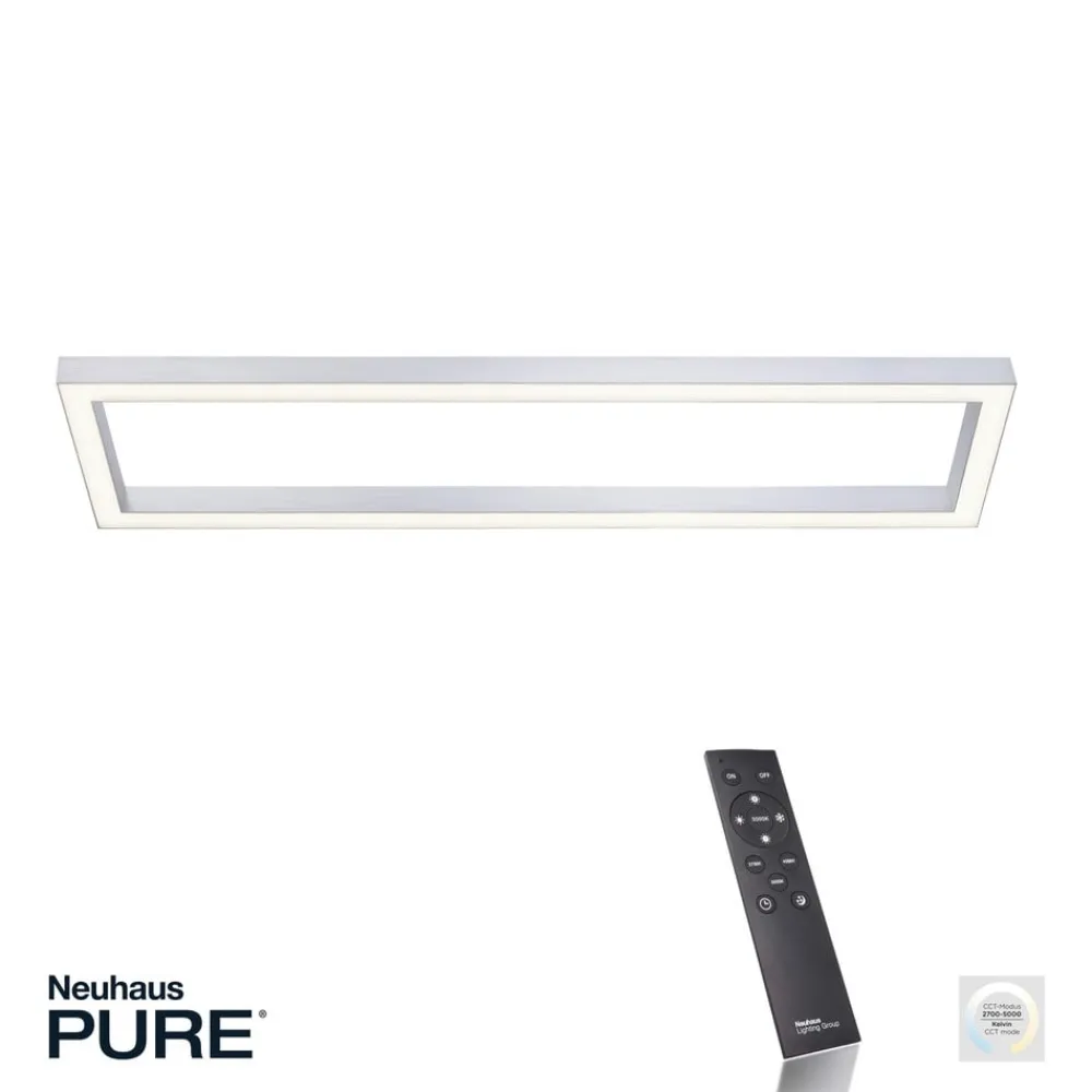Puristisk LED-loftlampe Pure Lines med dæmpbar og CCT-funktion Den firkantede LED-loftlampe Pure Lines imponerer med sit puristiske design, som gør det nemt at integrere den i forskellige boligområder. Lyset udsendes mod gulvet og kan styres med den medfølgende fjernbetjening. Det er muligt at ændre lysfarven fra varm hvid til universalhvid. Loftlampen kan også nemt dæmpes. Det gør det muligt at justere lysforholdene, så de passer til individuelle behov. Takket være den integrerede hukommelsesfunktion vender lampen tilbage til den sidst valgte lysindstilling, når den tændes.