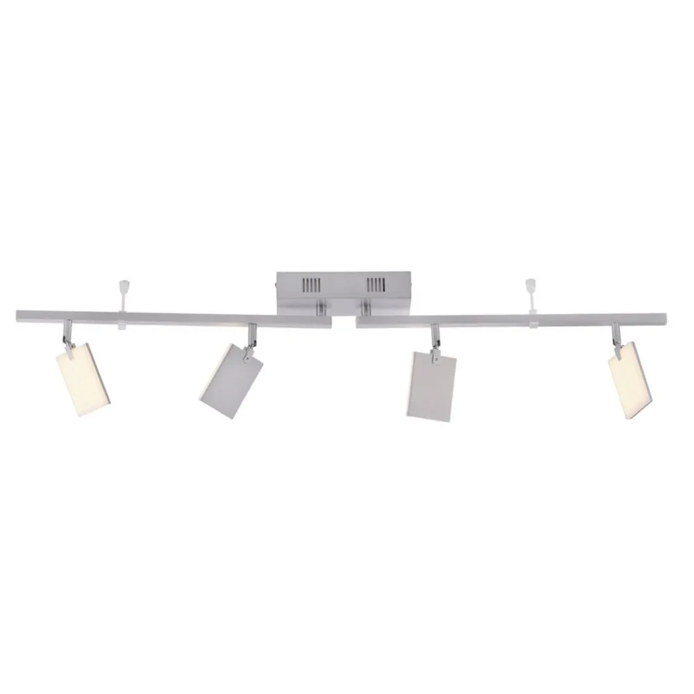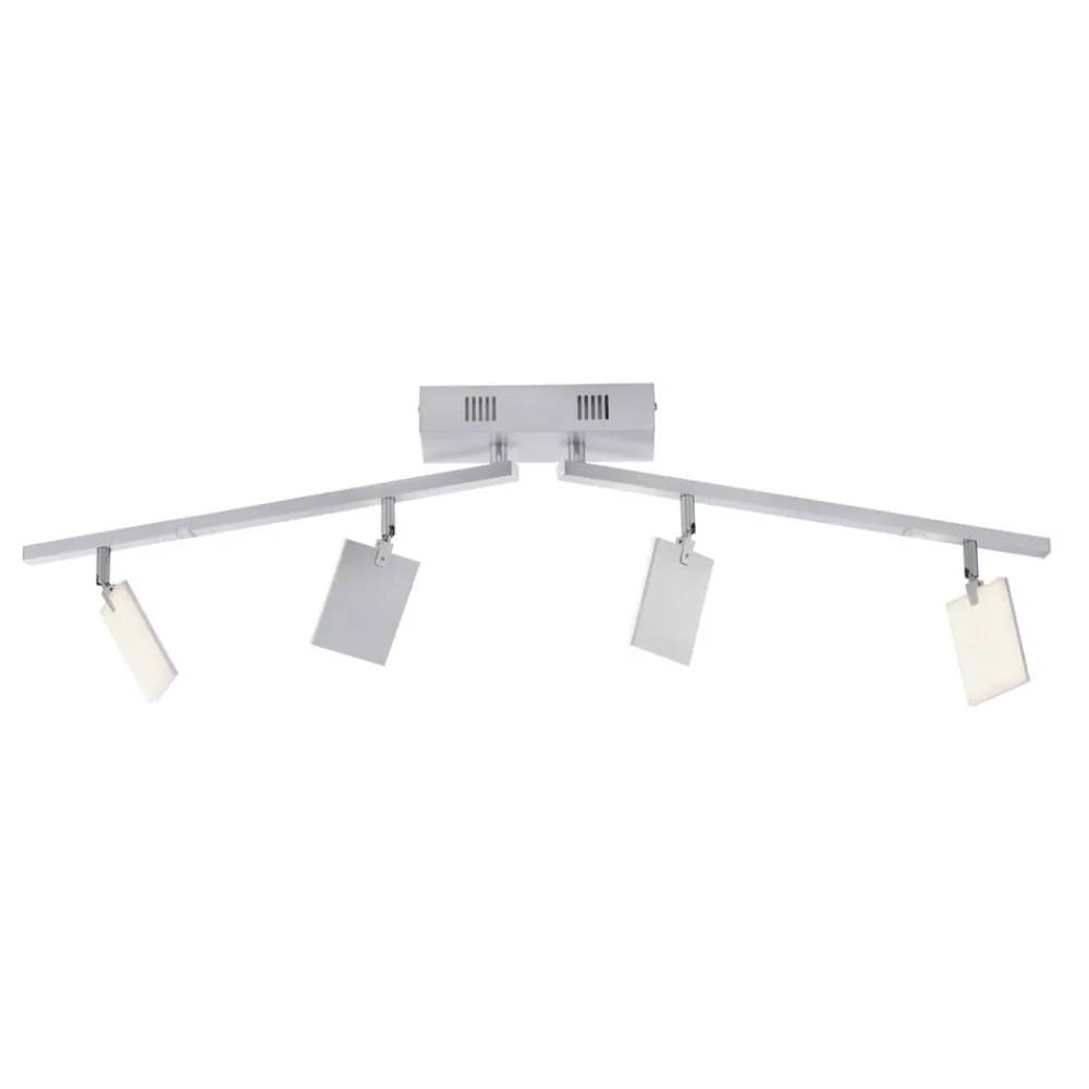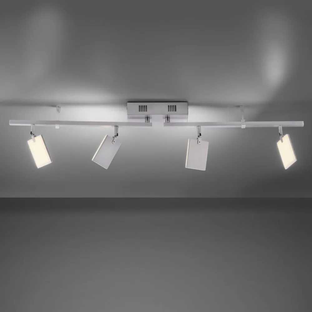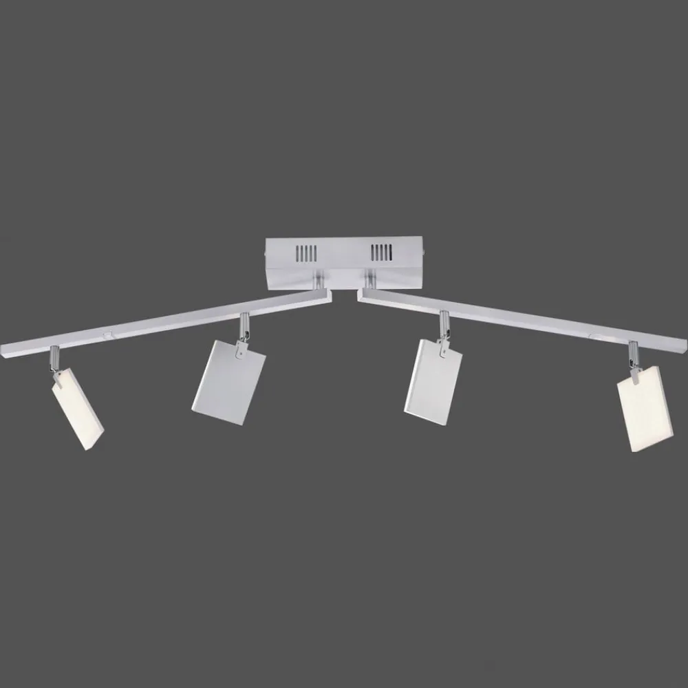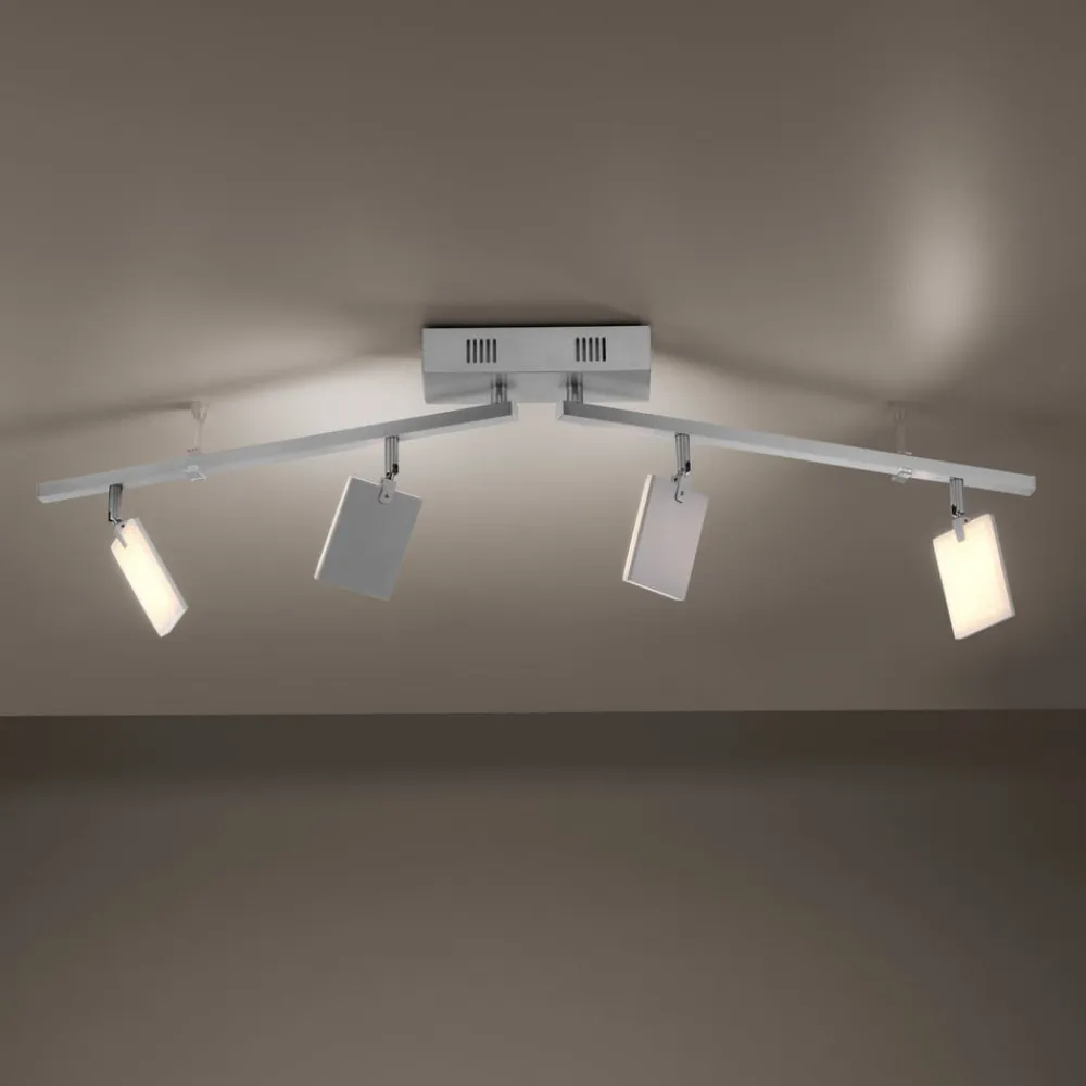 PURE Mira LED-loftslampe med fire justerbare lyselementer, lysstyrke og farvetemperatur kan justeres via fjernbetjeningen Mira LED-loftslampen beriger moderne stuer og lounges med passende lys og moderne design. To horisontalt drejelige arme, hver udstyret med to firkantede lyspaneler, er monteret under den rektangulære loftskasse. Takket være deres evne til at rotere og dreje giver disse yderligere muligheder for at justere justeringen. På den ene side af hvert af lyselementerne er der monteret en LED-plade bag et satineret akryldæksel. Både lysudbyttet og farvetemperaturen kan reguleres med den medfølgende fjernbetjening. Den aktuelle indstilling gemmes, når lyset slukkes, og er tilgængelig igen, når det tændes (hukommelsesfunktion).