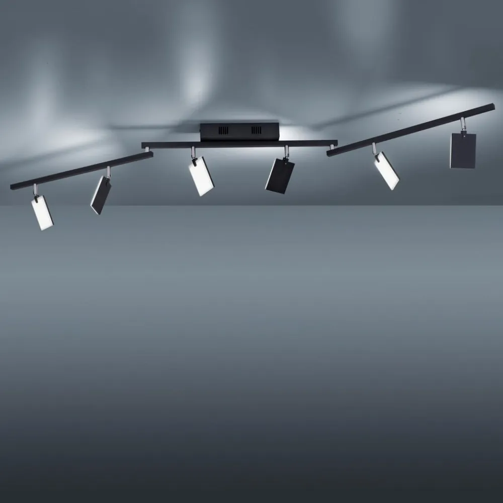 PURE Mira LED-loftslampe med seks justerbare lyselementer, lysstyrke og farvetemperatur kan justeres via fjernbetjening Med et åbent, minimalistisk design og en lang række muligheder for præcis justering, så den passer til forholdene i rummet, er Mira LED-loftslampen med seks lys det ideelle valg til omfattende rumbelysning i moderne miljøer. Aluminiumskonstruktionen består af en rektangulær loftskasse og tre arme, der er fastgjort i enderne ved hjælp af drejeled, som kan justeres på linje eller i en hvilken som helst vinkel i forhold til hinanden. Hver armsektion er udstyret med to rektangulære lyselementer monteret nedenunder, som igen kan drejes og svinges, så lyset fra LED-pladerne, der er installeret bag satinbelagte akryldæksler, kan rettes mod det ønskede område. Der medfølger en fjernbetjening til styring, som gør det muligt at dæmpe og justere farvetemperaturen, så Mira giver den rette belysning til ethvert miljø og tidspunkt på dagen. Efter tænding genaktiveres den sidst valgte indstilling (hukommelsesfunktion).