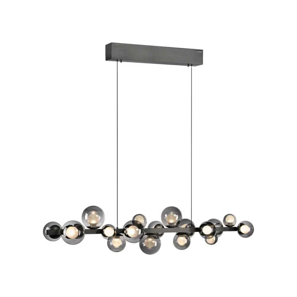 Fleksibel, dekorativ og alsidig i moderne boligindretning – sådan præsenterer LED-pendellampen PURE E-Popup sig. Den er udstyret med 18 kugleformede lampeskærme af glas, der hver især består af en ydre, gennemsigtig sfære og en indre, satineret sfære. LED’erne, der er integreret i kuglerne, er dæmpbare og kan reguleres i farvetemperatur (2.200 til 5.000 K) med den medfølgende fjernbetjening. Desuden muliggør e-LIFT-funktionen en elektrisk drevet højdejustering; elektronikken er placeret i baldakin. Når lampen tændes igen, er den sidst valgte indstilling tilgængelig igen (hukommelsesfunktion).