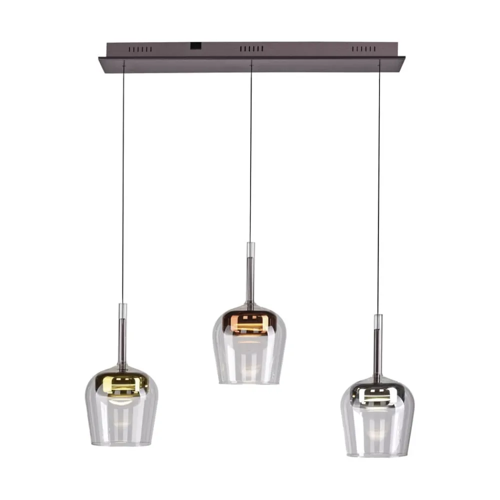 Q-Kon udendørs hængelampe med lampeskærme i glas og metaldetaljer – smart og kan styres med fjernbetjening Q-Kon hængelampen er både en æstetisk og funktionel tilføjelse til moderne stuer og opholdsrum. De tre lampeskærme, der hænger på række, er hver især udstyret med buet, gennemsigtigt glas, der smalner af i bunden. Hver skærm indeholder en aluminiumskrop med en finish i guld, bronze eller sølv. De nedadrettede LED-moduler giver direkte bord- eller områdebelysning. Takket være Comfort Lift kan højden på pendlen til enhver tid justeres manuelt, og en passende fjernbetjening til at tænde, dæmpe og justere farvetemperaturen er allerede inkluderet i leveringsomfanget. Ud over fri justering af lyset giver det også forudkonfigurerede muligheder, så den perfekte belysning er praktisk tilgængelig i næsten enhver situation. Alternativt kan Q-Smart-Home pendellampen integreres trådløst i ZigBee-baserede smart home-systemer (bro kræves) for at styre den via app eller stemmekommando, afhængigt af konfigurationen.