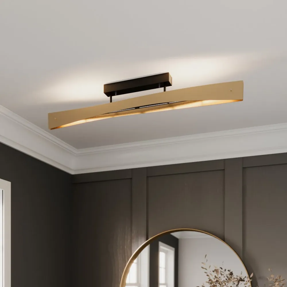 Messingfarvet, tyskproduceret LED-loftslampe Lian i buet form, dæmpbar, up- og downlight Denne loftslampe med de to buede skærme passer godt til moderne omgivelser, men er også velegnet til mere klassisk interiør, da størstedelen af lyset er i en varm messingtone, hvor overfladen er blevet omhyggeligt færdiggjort i hånden. Loftsbeslaget giver med sin sorte overflade en smuk kontrast i det samlede design. De to skærme er smukt bølgede og giver smukke lysrefleksioner, hvor lyset slipper ud både opad og nedad, hvilket skaber en smuk allround lyseffekt, der opleves som meget behagelig. Når den er monteret eller udstyret med en ekstern lysdæmper (fase tændt eller fase slukket), er det også muligt at justere lysstyrken efter ønske og skabe både stemningen af en middag med levende lys og skarpt lys til god belysning af bordoverfladen. Farvegengivelsesindekset (CRI>90) er meget godt, så farverne i rummet gengives på en særlig ægte og naturlig måde. LED’erne af høj kvalitet er også kendetegnet ved god effektivitet og høj lysstyrke – ideelt til hovedbelysningen i rummet. Et særligt stort tilslutningsrum i loftboksen gør installationen lettere, da alle kabler og komponenter nemt kan placeres. Bedste design og højeste kvalitet fremstillet i Tyskland!