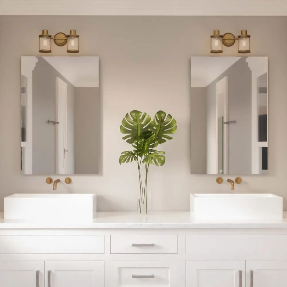 Riggs-væglampe med IP44-beskyttelse, to lys Riggs-væglampen med to lys er lavet af stål og har en antik messingfinish. Skærmenes klare glas med et rillet mønster og metaludtagene i bunden fuldender lampens look. Riggs-væglampen monteres over badeværelsesspejlet og giver et behageligt lys på badeværelset, hvor den kan bruges uden problemer takket være IP44-beskyttelsesgraden.
