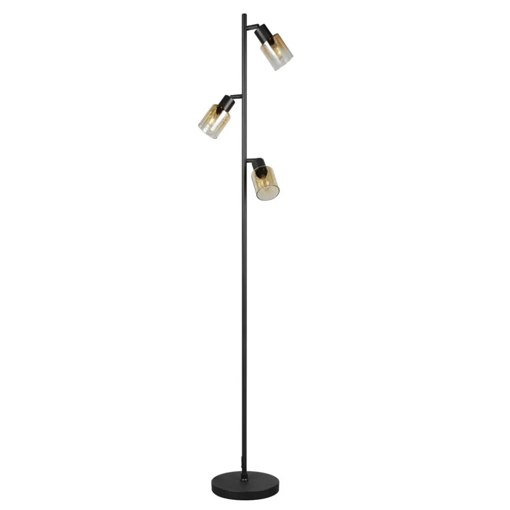 Cadiz gulvlampe kombinerer et moderne design med materialer af høj kvalitet som metal og glas. Kombinationen af sort stel og ravfarvede glaselementer sætter elegante accenter og passer harmonisk ind i forskellige indretningsstilarter. Med sin 3 lyskilder-konstruktion sikrer den en jævn og behagelig lysfordeling, der skaber en indbydende atmosfære i både stuen og soveværelset.