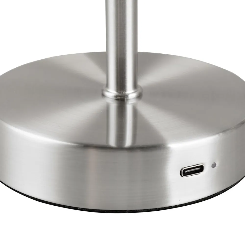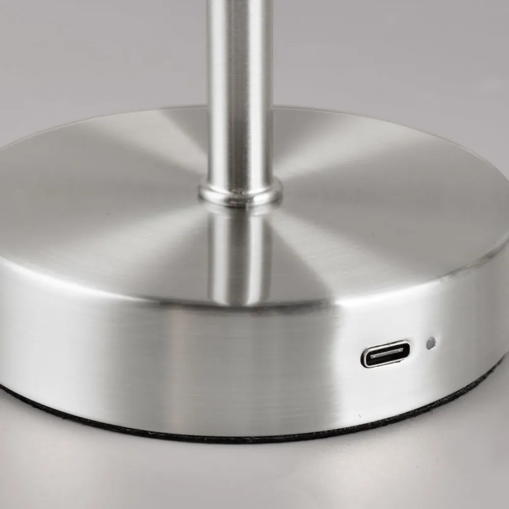 Jeff LED-bordlampe med genopladeligt batteri og USB-ladekabel Jeff er en LED-bordlampe med et integreret genopladeligt Li-ion-batteri og kan derfor bruges overalt i stuen eller gangen, helt uafhængigt af strømforsyningen. Den er lavet af metal og leveres med et 120 cm langt USB-C-ladekabel. Netadapteren til stikkontakten medfølger ikke. Bordlampen er udstyret med en kontakt, der kan bruges til at indstille den til tre lysstyrkeniveauer. Med et fuldt opladet batteri holder lyset i op til 12 timer ved minimum lysstyrke og op til 4 timer ved fuld lysstyrke. Batteriet kan genoplades inden for 6 til 8 timer.