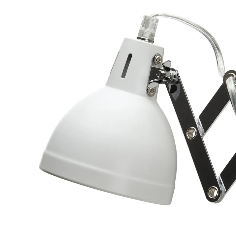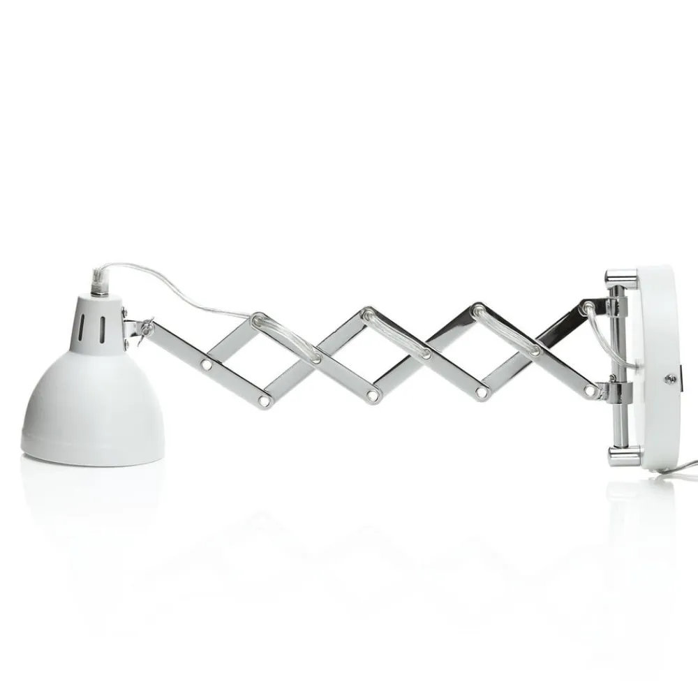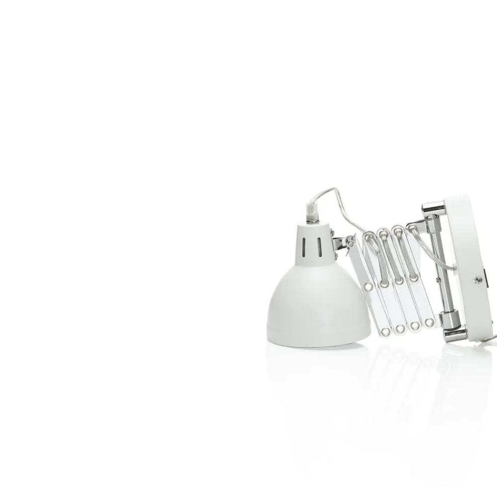 Scissor-lampe Scissor i mat hvid med stik Scissor-væglampens store harmonika-led, som strækker sig fra vægbeslaget til lampeskærmen, er særligt iøjnefaldende. Det gør det muligt at bevæge lampehovedet frem og tilbage og understreger samtidig perfekt lampens industrielle stil. Væglampens lyse kabel løber gennem nogle af hullerne i de takkede metaltråde. For enden af harmonikastrukturen sidder lampeskærmen, som har en klassisk klokkeform og er designet i mat hvid. Vinklen på metalskærmen kan også justeres ved hjælp af en vingeskrue, hvilket gør Scissor perfekt til brug som læselampe. Ledningen, som også har en ledningskontakt, hænger ned fra det runde vægbeslag. Scissor-væglampen er et attraktivt produkt, der er indbegrebet af industriel stil og samtidig er yderst funktionelt.