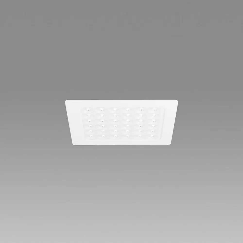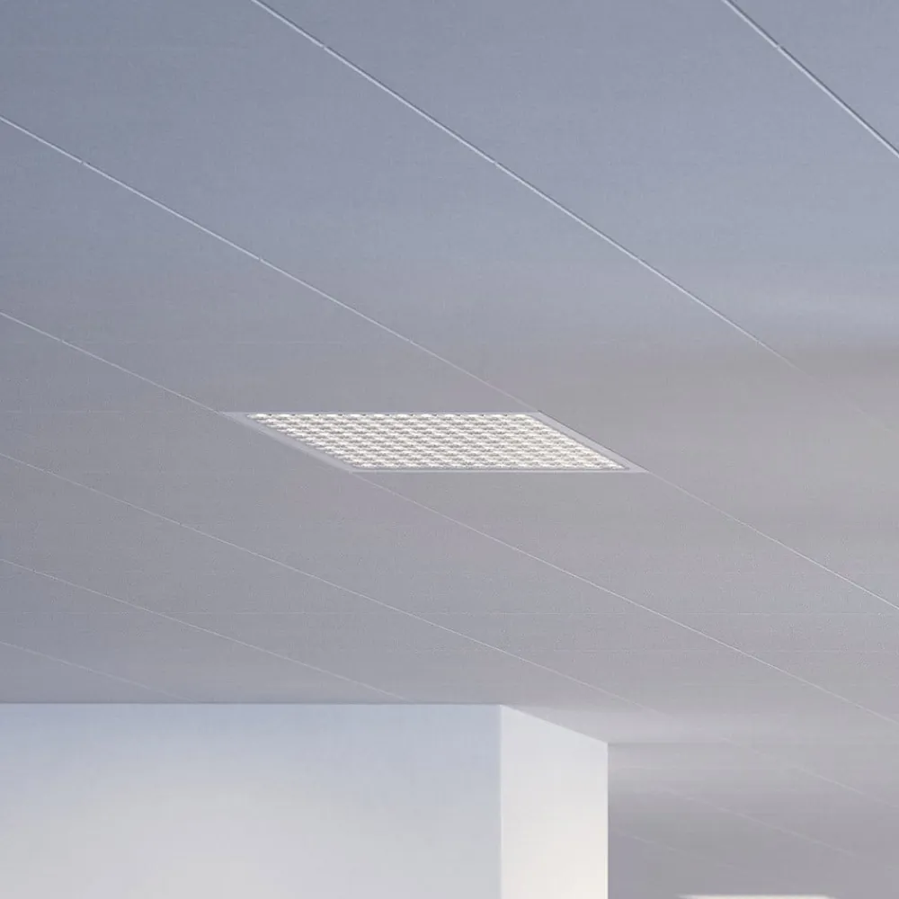 Firkantet indbygningslampe Dime til alle standardlofter LED-indbygningslampen med LED giver effektiv rumbelysning til kontoret. Den har et certificeret MINERGIE®-modul fra producenten Regent, som garanterer fremragende energieffektivitet. Armaturet er lavet af hvidlakeret metal og er udstyret med “Square Optics”-kollimatoroptik, som giver ideel direkte arbejdsbelysning uden flere skygger – Med integreret forkobling (dæmpbar) – Blændingsreduktionsindeks UGR: < 19 – Slagfasthed: IK06