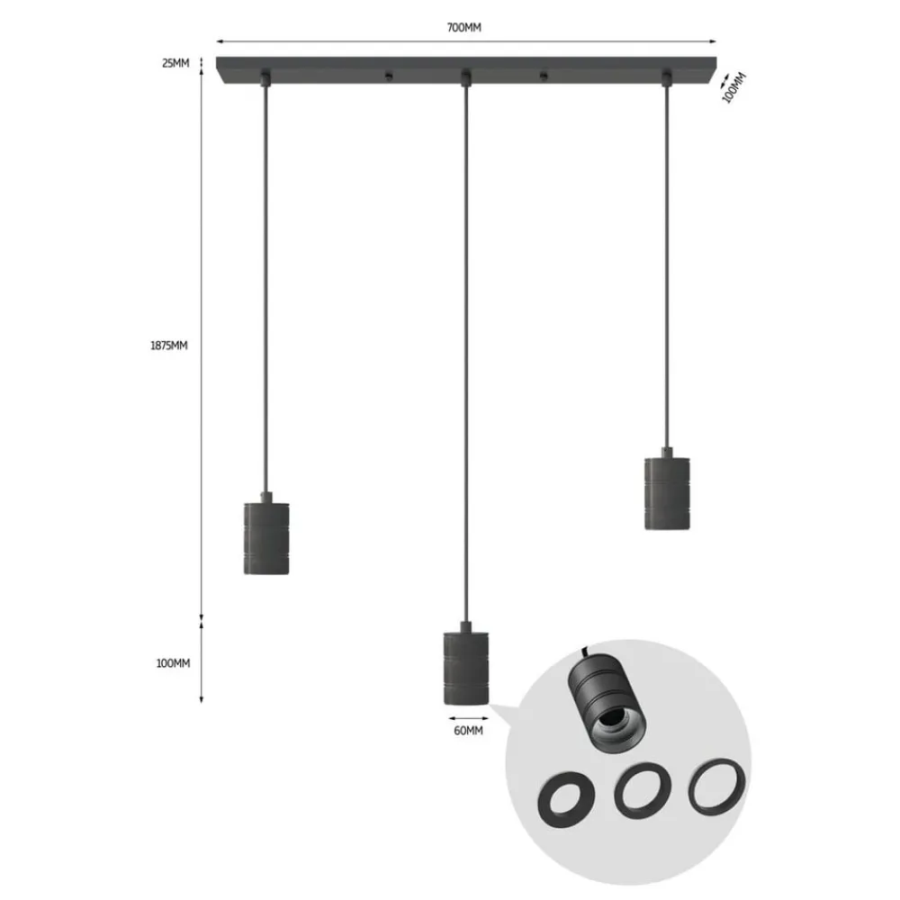 Pendellampe Retro med tre lamper og rektangulær baldakinEn rektangulær baldakin danner grundlaget for pendellampen Retro med tre lamper. De tre åbne fatninger, som er dekoreret med et stribet mønster, er fastgjort til den. De åbne fatninger er særligt velegnede til brug af store lyskilder med synlige glødetråde. Der medfølger to valgfrit anvendelige ringe pr. fatning, som sikrer en plan montering af lyskilderne. Passende E27-pærer kan købes separat via tilbehør.