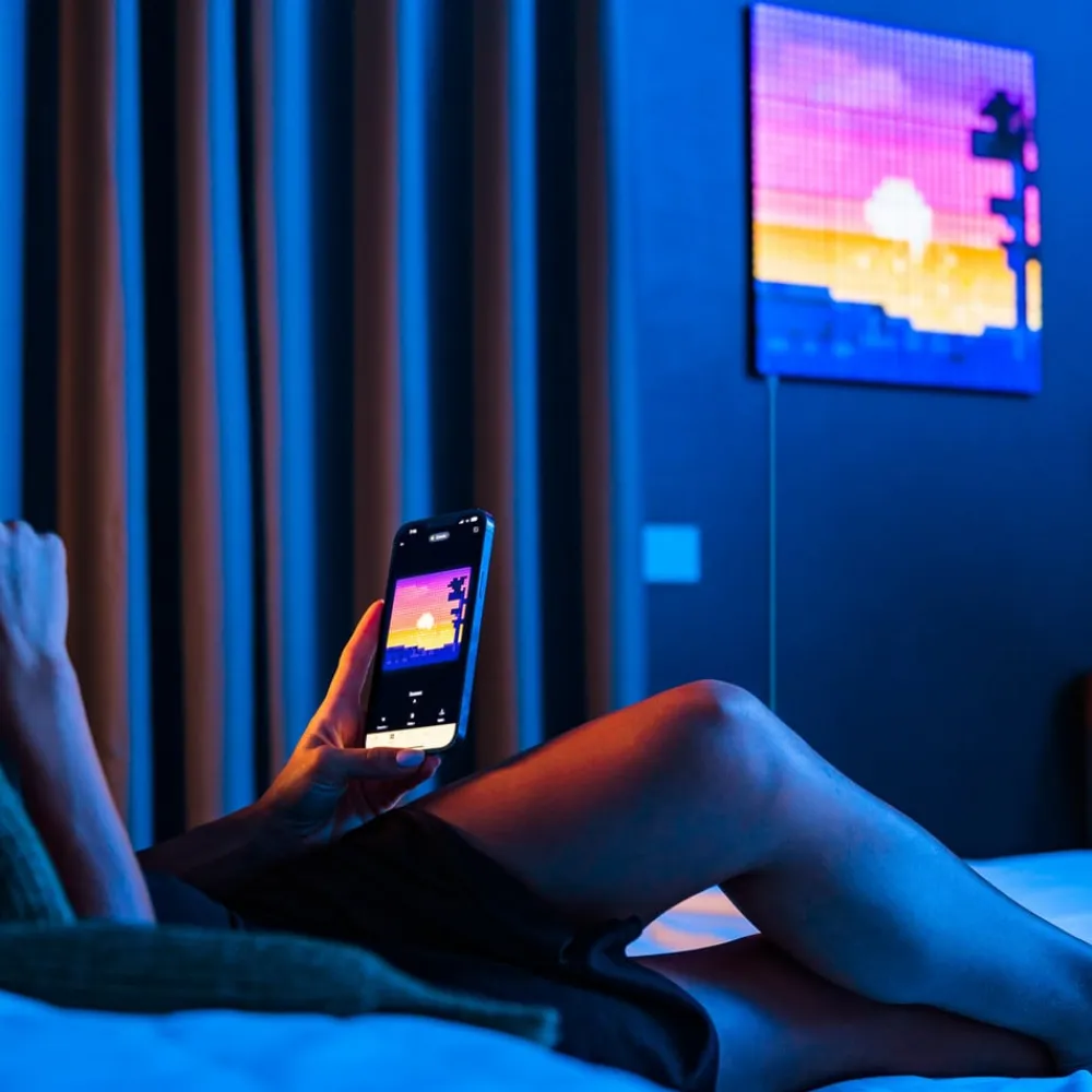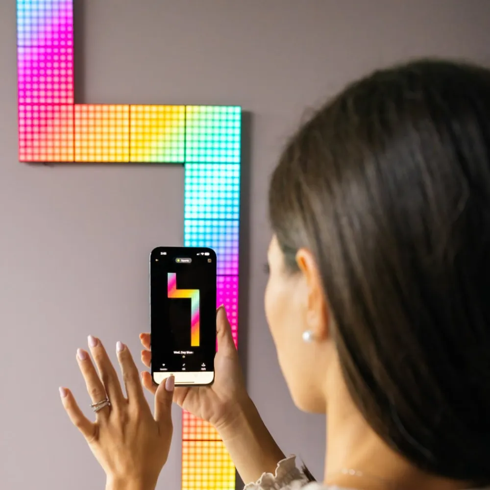 Twinkly RGB-Square til udvidelse Dette farverige panel bruges til at udvide LED-lysdekorationen med Twinkly RGB-Squares. Separat betjening er ikke mulig – der kræves et startsæt. Hvert startsæt kan udvides til i alt op til 15 paneler.